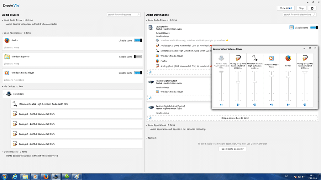 Um Signale all der Anwendungen – zu ihnen gehören neben Klassikern wie Media-Player, iTunes etc. und auch nicht auf den ersten Blick als AudioProgramm zu identifizierende Anwendungen wie PowerPoint oder InternetBrowser – mit den Dante-Geräten auszutauschen, ist der Dante-Controller zu nutzen. Dazu sind die Anwendungen lediglich für den Dante-Austausch in Dante Via zu aktivieren – bisher erschienen aber nicht alle Anwendungen automatisch im Dante-Controller und erschwerten unnötig die Übersicht. In der Matrix lassen sich dann die einzelnen Kanäle wie gewohnt Ausgängen zuordnen. Im Dante-Controller wird auch angezeigt, ob die Netzwerkkomponenten inklusive der Rechner korrekt im Netzwerk arbeiten.