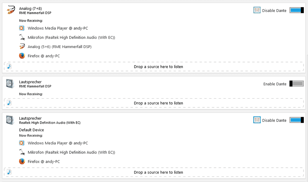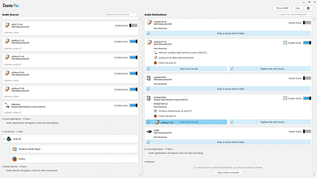 Die Software-Oberfläche ist so konzipiert, dass die Zuweisung von Audiosignalen auf Ausgänge genauso einfach ist wie das Verschieben von Dateien – per „Drag-and-Drop“. Mit der Verfügbarkeit aller Audioquellen der Computer, egal ob es sich um Schnittstellen am Rechner selber, an einem angeschlossenen Gerät oder virtuelle Ein- und Ausgänge all der vielen Audioanwendungen handelt, haben sich auch neue Wege eröffnet, Signale ins DanteNetzwerk einzuspeisen: Mit dem Dante-Controller stehen alle Signale am und im Computer im Dante-Controller zur Verfügung und können z. B. auch an einem Dante-Gerät ausgespielt werden.