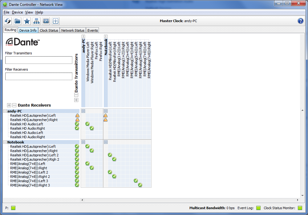 Im Dante Controller stehen auch die einzelnen Schnittstellen und Anwendungen in der Matrix zur Verfügung, auch wenn nur zwei Rechner im Netzwerk sind. (Bild: Christiane Bangert)