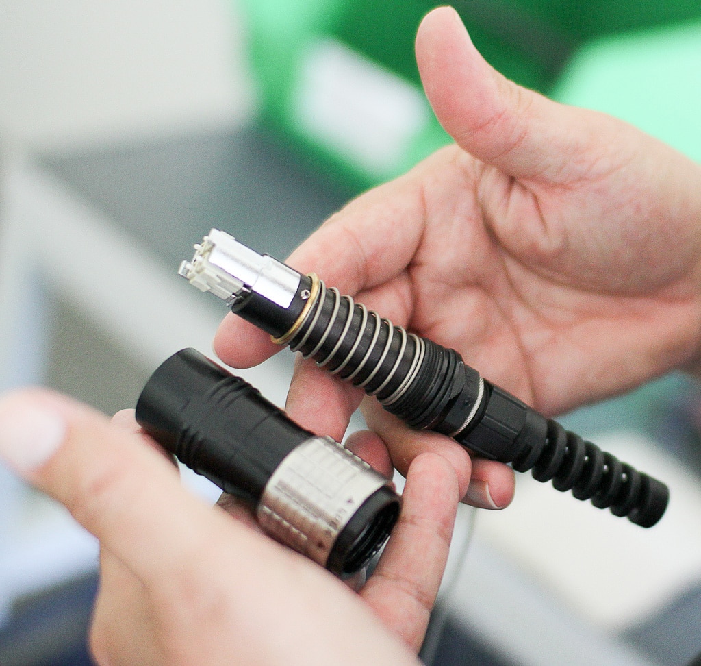 „Fiber 4“-Steckverbinder eines Fiberoptic-Multicores mit zehn Zentimeter Zugentlastungsmöglichkeit, ohne dass die Kraft direkt auf die Faser geht, dank der Feder. Es sei zum Stolz des Herstellers Broadcast-Standard in fast jedem Rundfunkmischpult (Bild: Nicolay Ketterer)