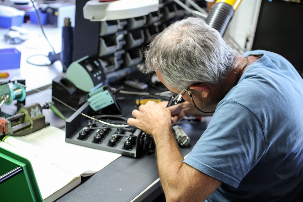 Mitarbeiter beim Löten einer Stagebox (Bild: Nicolay Ketterer)