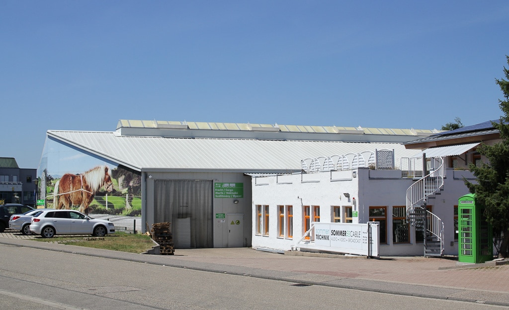 Produktmanager Pascal Miguet sitzt in einem der sonnendurchfluteten Konferenzräume mit viel Tageslicht, umrahmt von den Holzstrukturen des großen dreistöckigen Gebäudes im Industriegebiet der kleinen baden-württembergischen Gemeinde Straubenhardt, nahe Karlsruhe. Die Umgebung am Rande des Nordschwarzwalds verströmt Naturidyll, fast schon Unberührtheit, wäre da nicht jene industrielle Fortschrittlichkeit, die einen interessanten Kontrast verleiht. Eines der großen Lager, mit dem Parkplatz zur Straße, fasst mit einem Wandbildnis – ein Pferd, das eine große hölzerne Kabelrolle mit Sommer Cable-Logo zieht – die scheinbaren Gegensätze aus ländlicher Umgebung und moderner Technik zusammen. Auf der anderen Seite der Einfahrt prangt eine alte englische Telefonzelle, für Sommer passend in der hellgrünen Hausfarbe umlackiert und mit „Anmeldung“ beschriftet – zur Dekoration, Eingang und Anmeldung sind im Gebäude modern gehalten. Die Firma, 1999 gegründet, feiert aktuell ihr 20-Jähriges Bestehen.