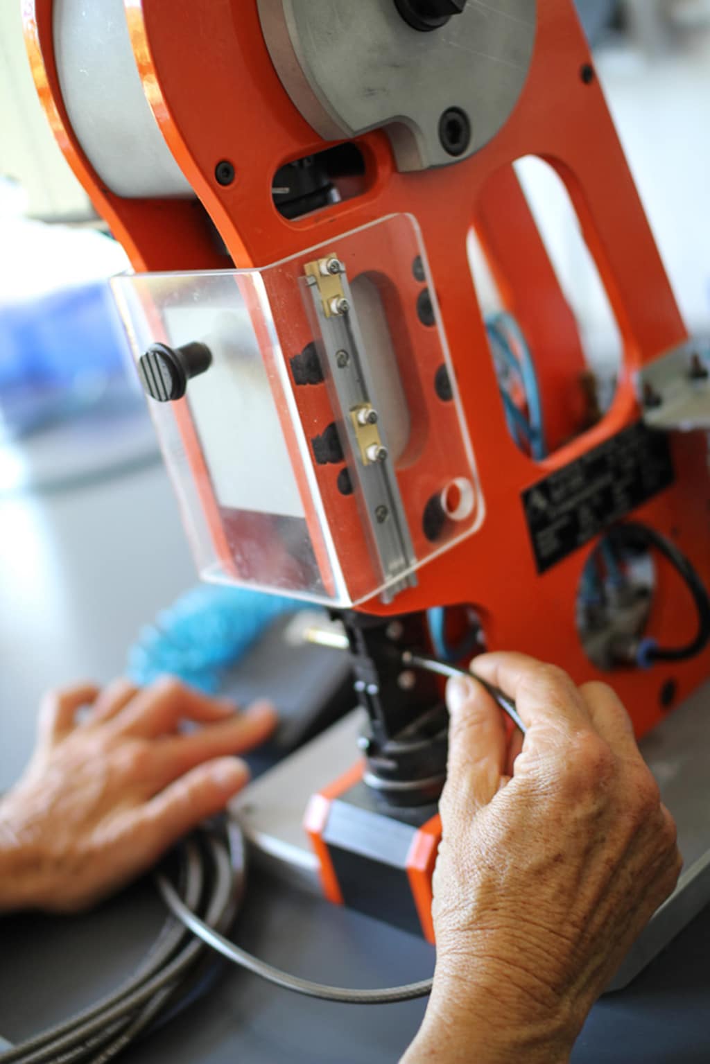 Eine Angestellte nimmt eine sogenannte „Doppel-Hexagonal-Crimpung“ vor, es zischt und tackert kurz. „Das Steckergehäuse wird anschließend auf das Kabel geschoben und gleichzeitig geprüft“, erläutert Miguet. „In einer Stunde lassen sich zwischen zehn und 15 Gitarrenkabel pro Person löten. Hier lassen sich pro Stunde – je nach Organisation – 150 Kabel fertigen, fertig geprüft. Die Zugentlastungskraft ist vier Mal so hoch wie bei Standardklinke, 16 Kilogramm bei einem PVC-Mantel.“