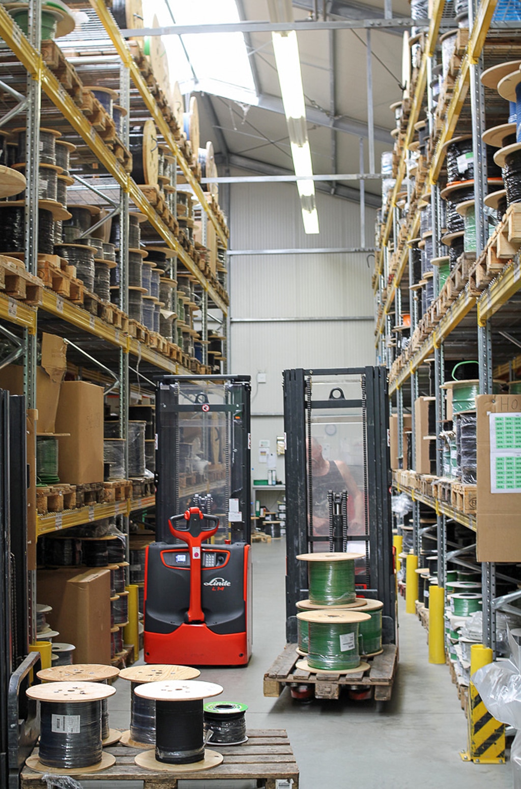 Der Firmenrundgang führt im Erdgeschoss durch endlose Lagerreihen, Verpackungsräume sowie die Kabelkonfektion. Dort stehen neben High-Tech, etwa einer Maschine, die mehrstufig abisoliert, auch Prototypen selbstentwickelter Kabelwindemaschinen mit Handkurbel. „Die befinden sich mittlerweile im Katalog, zwischenzeitlich verkaufen wir davon tausende.“