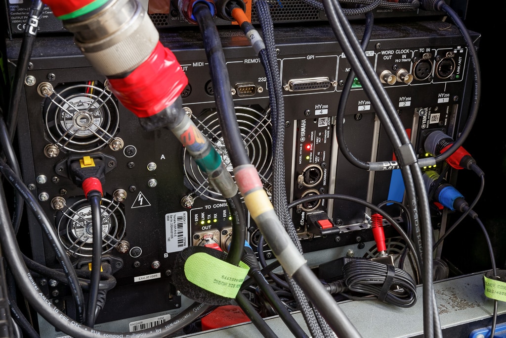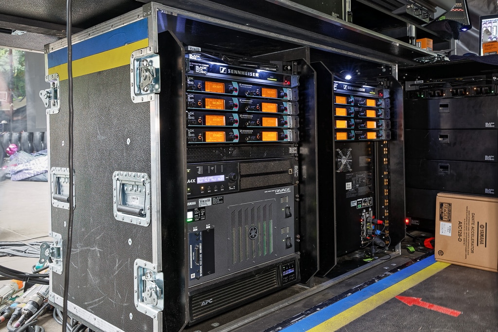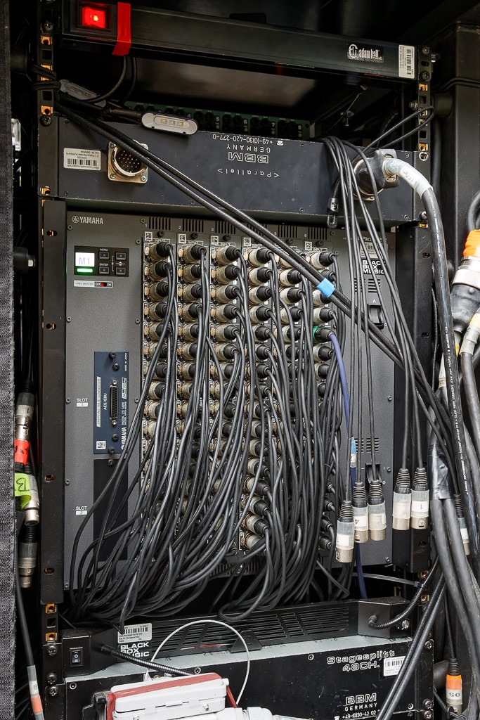 In Berlin setzte sich das Yamaha Rivage PM10 aus der Pultoberfläche CS-R10, der DSP-Engine DSP-R10 und zwei RPio622 I/O-Racks zusammen, wobei die Ein- und Ausgänge vollständig separiert waren: Eines der I/O-Racks war ausschließlich mit Inputs ausgerüstet und befand sich gemeinsam mit dem Splitter, den Digico SD-Racks sowie mehreren Sennheiser EM-6000-Drahtlosempfängern in großen 19″-Schränken, während das zweite, mit insgesamt 96 Ausgängen bestückte I/O-Rack in einem rollenbewehrten Doppel-Case untergebracht war, das als Standfläche für die CS-R10 diente. Die modular aufgebauten Yamaha RPio622-Units lassen sich frei bestücken, so dass beliebige Kombinationen von Inputs und Outputs möglich sind. Bei der A/D-Wandlung setzt Horst Hartmann auf eine hohe Abtastrate von 96 kHz, was möglicherweise dem Klang, ganz sicher aber kurzen Durchlaufzeiten zuträglich ist. „Ich strebe so wenig Latenz wie möglich an!“, sagte Hartmann in Berlin und betonte, dass Laufzeiten in seinem Aufbau auch für diesbezüglich kritische Kandidaten wie Schlagzeuger oder Percussionisten kein Thema sind.