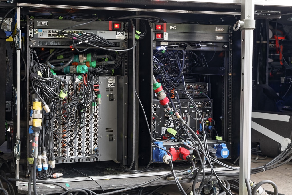 In Berlin war der von einem schwarzen Zelt gegen Regen geschützte Monitorplatz mit zwei Konsolen versehen, die ihre Eingangssignale separat voneinander über einen passiven Splitter erhielten: „Ich möchte mit niemandem sharen – mir ist das zu kompliziert“, kommentierte Horst Hartmann. „Ich arbeite gerne mit reichlich Gain, was in dieser Form bei vielen Kollegen nicht unbedingt der Fall ist. Manchmal kommt man dann einfach nicht zusammen …“ Der international erfahrene Monitorspezialist hatte sich für ein Yamaha Rivage PM10 entschieden, während Jon Lewis ebenso wie sein Kollege am FOH-Platz auf eine Digico SD7 (mit gemeinsam genutzten SDRacks) setzte. Für audiotechnisch vorbelastete Betrachter ergab sich daraus am Monitorplatz ein bemerkenswertes Bild, das zwei Pulte mit gleicher Kampfklasse und vergleichbarer Preisgestaltung auf engstem Raum verband.