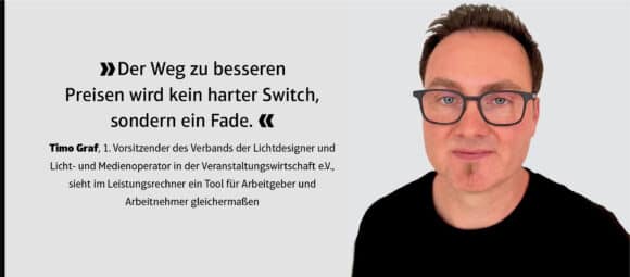 Timo Graf: Die ersten Rückmeldungen von Kollegen aus der Branche zeigen uns, dass wir genau den richtigen Nerv getroffen haben. Zum einen ist der Leistungsrechner im Backoffice-Alltag von Solo-Selbstständigen eine enorme Hilfe und macht vieles einfacher und strukturierter. Darüber hinaus freuen sich viele Licht- und Medientechniker, dass damit endlich eine längst überfällige Preisdiskussion angestoßen wird.