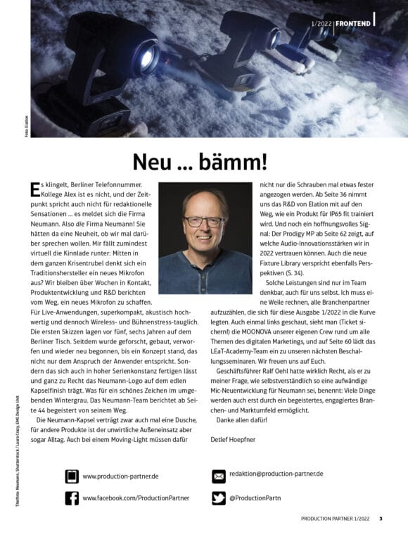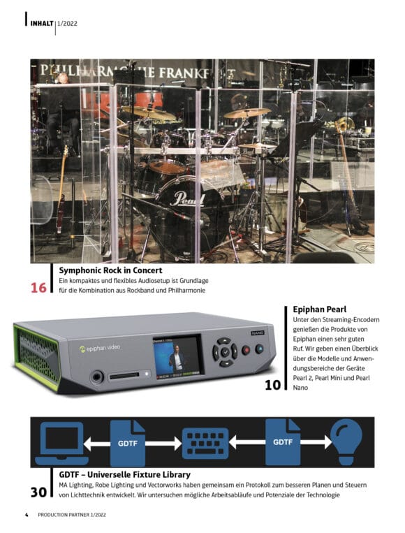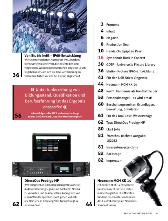 Symphonic Rock | Design-Honorare | Epiphan Pearl | DirectOut Prodigy MP | Elation-R&D für IP65 | Business-Konflikte | GDTF Fixture Library | Personal