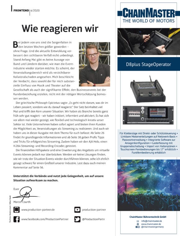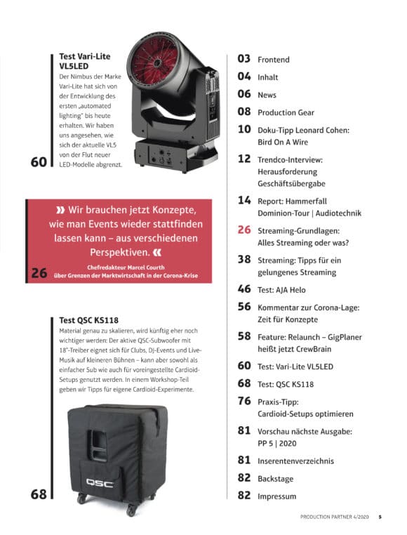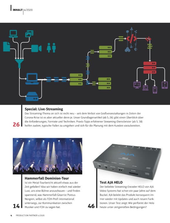 Streaming- Special: Basics, Praxis, Tipps & Tests +++ Hammerfall Dominion-Tour +++ Test: QSC KS118, Vari-Lite VL5LED & AJA HELO +++ Relaunch – GigPlaner heißt jetzt CrewBrain +++ Interview mit Trendco: Herausforderung Geschäftsübergabe5,80 €