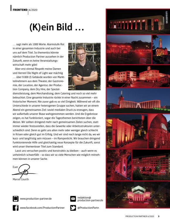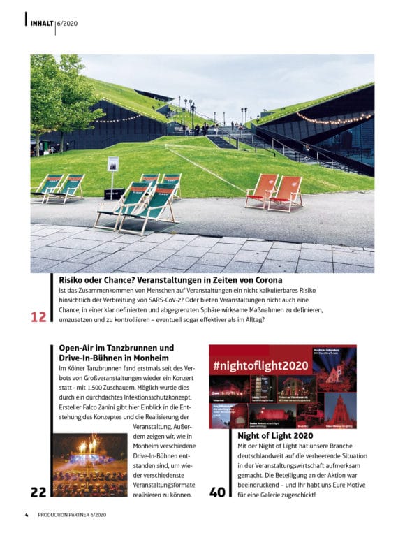 Night of Light 2020 - 9000 Gebäude leuchten - eine Industrie rückt zusammen +++ Veranstaltungen in Zeiten von Corona - Risiko oder Chance? +++ Open-Air im Tanzbrunnen und Drive-In-Bühnen in Monheim +++ Endlich wieder Bässe spüren! Erste Veranstaltungen finden statt und lösen Emotionen aus +++5,80 €