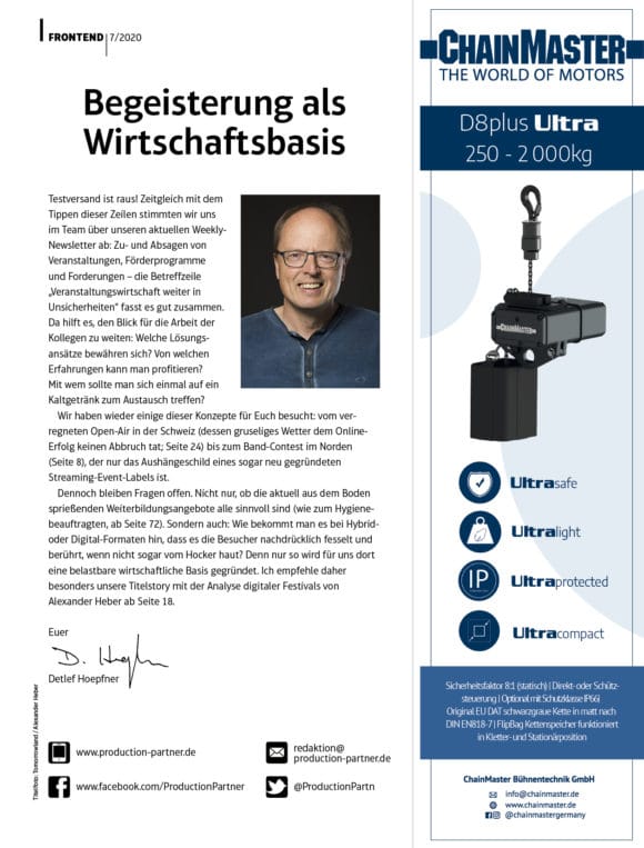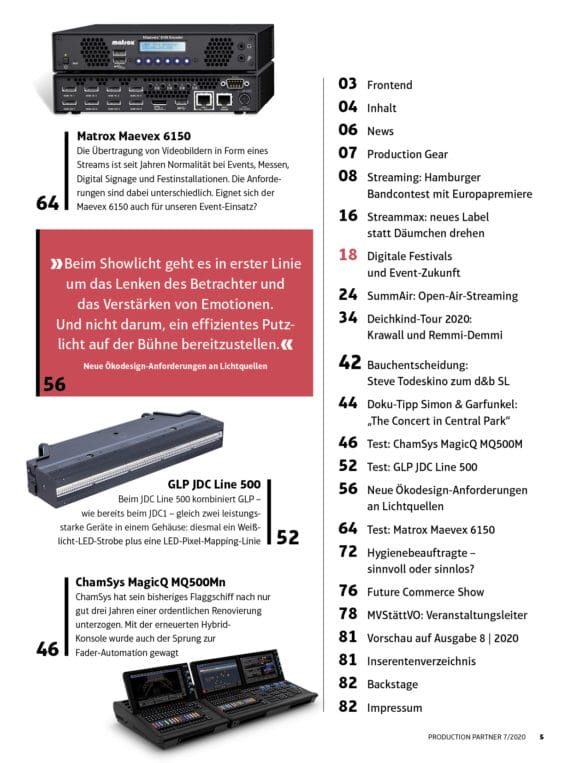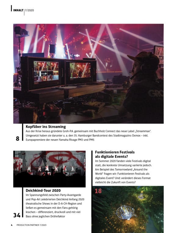 Kopfüber ins Streaming: Gro- P.A. gründet mit Buchholz Connect "Streammax" +++ Digitale Festivals: Funktionieren Festivals als digitale Events +++ Deichkind-Tout 2020: Das Spannungsfeld zwischen Party-Avantgarde und Pop-Art +++ Im Test: ChamSys MagicQ MQ500M & GLP JDC Line 5005,80 €
