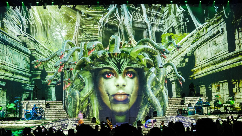 Imposante Momente Die Köpfe der Schlangen schienen sich regelrecht im 3D-Raum zu bewegen. Die Ausleuchtung der Tänzerinnen fügt sich ins Bild ein, gleichzeitig werden sie geschickt hervorgehoben. Diese angenehme und schwierige Balance zog sich gekonnt durch die komplette Show. (Bild: Harald Heckendorf)