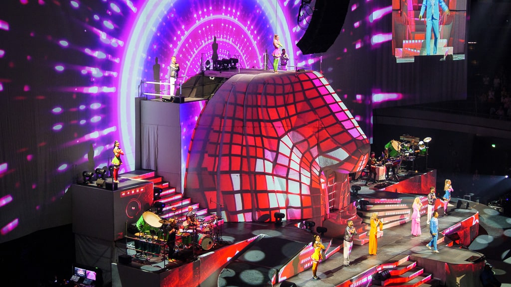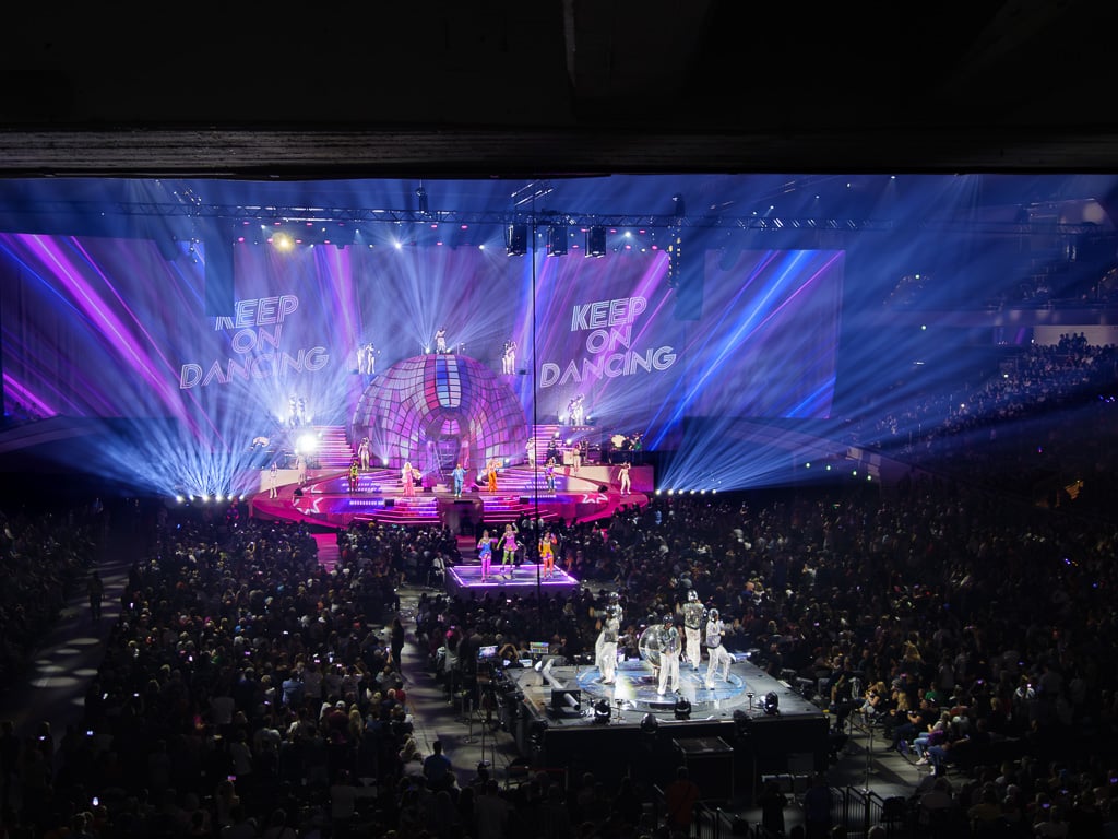 Im Zentrum der Hauptbühne stand der überdimensionale, begehbare Löwenkopf. Ausgehend von verschiedenen Höhenniveaus waren rechts und links des Kopfes Treppen und verschiedene Plattformen angeordnet, die allen Bühnenakteuren viel Bewegungsraum boten. Downstage war über die gesamte Breite ausreichend Platz für Tänzer und Sänger, upstage bildete die riesige Projektionsfläche einen imposanten Horizont, auf den fünf leistungsstarke Projektoren atemberaubende Welten projizierten. Die Hauptbühne schien nahtlos (über sanfte Treppen) in den Zuschauerraum überzugehen. In der Mitte des Innenraums befand sich eine quadratische B-Stage und direkt dahinter, hinter dem FOH-Platz, eine weitere, etwas größere Bühne, deren Oberfläche einen überdimensionalen Plattenspieler darstellte.