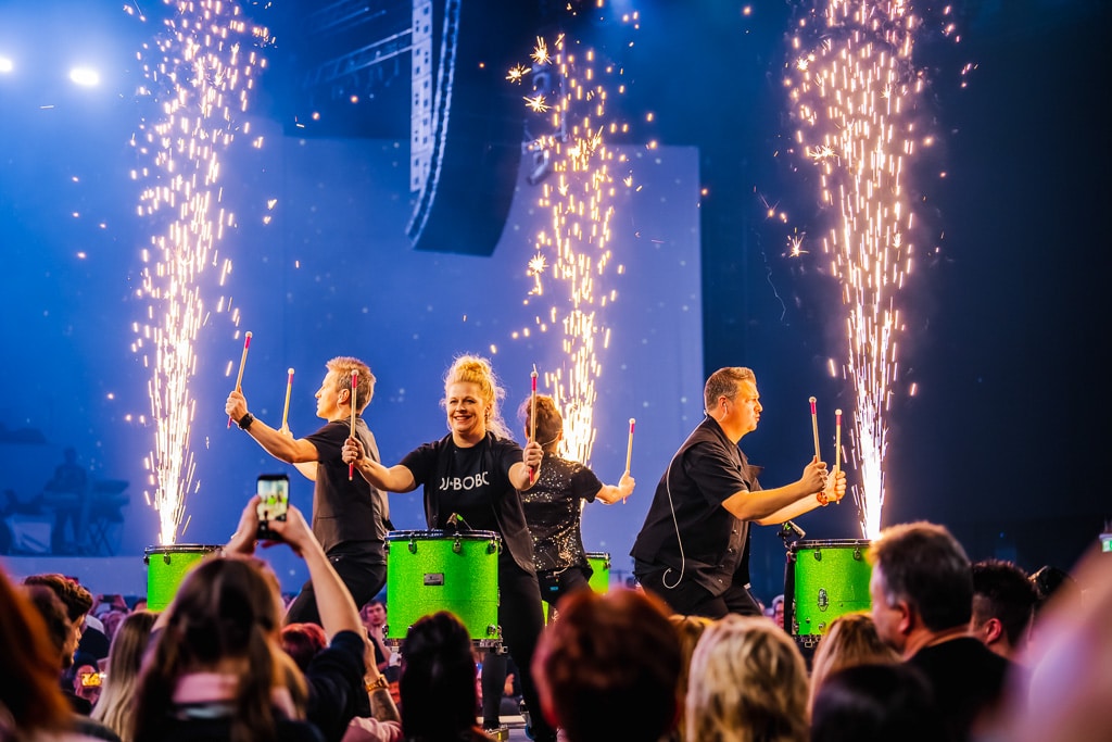 Einer der wenigen Play-Back-Momente Trommeln aus der Konserve – dafür Funken aus den Kesseln (Bild: JULIAN HUKE)