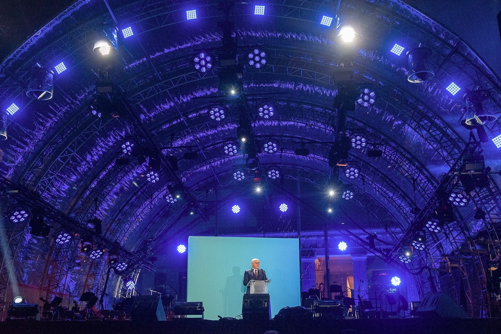 Auf den Gebäuden hinter den Bühnenwaren Elation Proteus Hybrid platziert, die in den Himmel strahlten. Links im Bild die VIP-Bühne, von der aus auch Bundestagspräsident Wolfgang Schäuble und Bundeskanzlerin Angela Merkel an der Feier teilnahmen (Bild: Lukas J. Herbers)