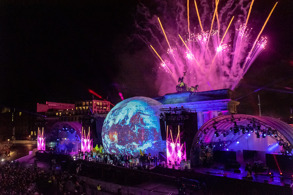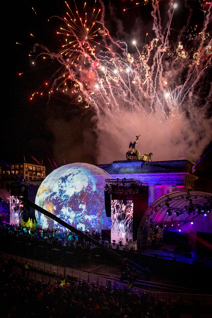 Projektionsdome mit Matrix Zwischen den links und rechts des Brandenburger Tors platzierten Bühnen wurde ein Projektionsdome errichtet, an dessen Rückseite eine Matrix aus 86 Martin VDO Atomic Dot angebracht war. Dazwischen wurden Ayrton Perseo Profiler verwendet. Dank GROSSE8 wurden hier u. a. weitere Wünsche, die noch während der Festivalwoche online eingesandt werden konnten, in Realtime auf den Dome projiziert