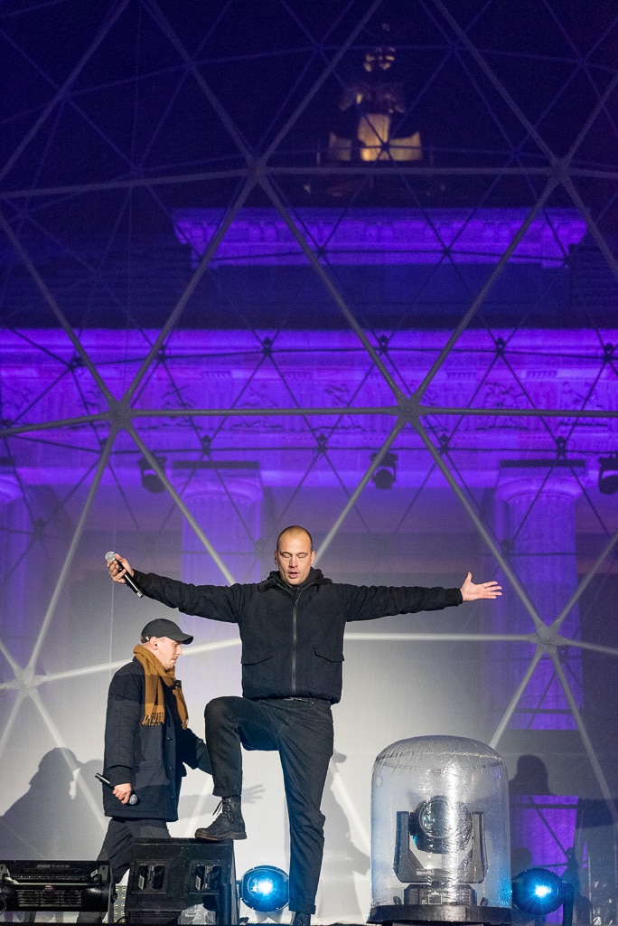 TransparenzDurch die Konstruktion des mit Gaze bespannten Projektionsdoms konnte das Brandenburger Tor (wie hier beim Auftritt von Zugezogen Maskulin) auch hinter der Bühne angemessen in Szene gesetzt werden (Bild: Lukas J. Herbers)