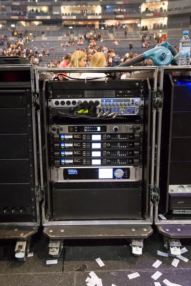 In einem großen Raum wie einer Arena kann man nicht aus zwei Quellen, die sich auch noch gegenüberstehen ein brauchbares Klangbild schaffen. Daher erfordert es eine sehr sorgfältige Vorgehensweise, denn schließlich soll für alle Anwesenden – auch für die am Ende des Beschallungsraums – zu keinem Zeitpunkt ein schlechtes Klangbild entstehen“, betonte FOH-Ingenieur Dave Bracey. Um diese beeindruckenden Fades für alle Konzertbesucher umzusetzen, wurde eine TiMax SoundHub-S32 Audio Showcontrol Matrix verwendet. Damit können „Timelines“ gezogen werden und die unterschiedlichen Fades (Blendzeiten) für alle Speaker. Überdies können auch die Delayzeiten nachgezogen und angepasst werden – zumal die Rear Hangs der B-Stage auch noch als Delays für die Main-PA (A-Stage) eingesetzt werden.