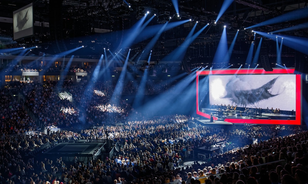 Zunächst sei der Signalweg des Mikrofons noch über den analogen Ausgang des Empfängers verlaufen, dann verglichen die Tonverantwortlichen das Mikrofonsignal mit dem des AES-Ausgangs. Der Klang sei dann noch besser geworden, schwärmte Dave Bracey. Inzwischen wird das AES-Signal von der Kapsel bis zu den Verstärkern genutzt. Nicht nur die Crew ist sehr zufrieden mit der Wahl, auch die Künstlerin, habe Gefallen an dem Klang der Digital 9000 Serie gefunden. Dass trotz des überzeugenden Klangs des Systems noch Signal-Processing nötig wurde, hatte andere Gründe: Nicht genug damit, dass für die Show im Wechsel eine 270- Grad- und eine 360-Grad-Beschallung erforderlich wurden, Adele singt auf der A-Stage zahlreiche Lieder auf einer Bühnenzunge nur wenige Meter vor den Line-Arrays.