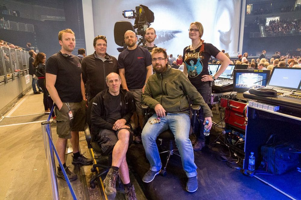 Licht-Crew Jamie Gorman (Lichttechniker), Chris Davis (Crew Chief), Luke Radin (System Tech), James Fredrickson (Lichttechniker), Sarah Janebrink (Lichttechniker) sowie (untere Reihe) Jim Mills (Dimmer) und Roland Greil (Lighting Director & Programmer) (Bild: Harald Heckendorf)