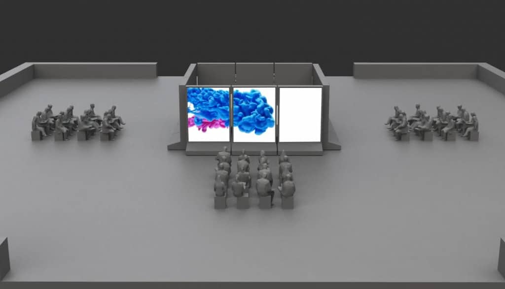 Danach brechen die Flächen auf geben eine dahinterliegende Präsentation frei und fahren an den Randbereich. Eine Kundin erzählte uns von dem Problem bei ihren Presseveranstaltungen, zunächst eine Plenums- und anschließend eine Workshop-Situation zu veranstalten. Die Leute müssen umziehen, der Moment ist immer ungünstig. Hier könnten das Publikum im gleichen Raum bleiben und sich einfach umdrehen.