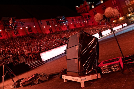 Das Innengelände der alten Basler Kaserne ist von beachtlicher Dimension; von der den Hof begrenzenden Rückwand bis zum FOH-Platz wurde eine Distanz von 100 Metern gemessen. Entlang der Längsseiten des Exerzierplatzes waren sechs schwarz lackierte Poles aufgestellt worden, auf denen jeweils ein Q7-Lautsprecher von d&b Audiotechnik thronte und in Richtung der oberen Tribünenplätze zeigte. Die näher am Geschehen angesiedelten Plätze wurden mit jeweils zwei schräg nach unten weisenden E3 beschallt.