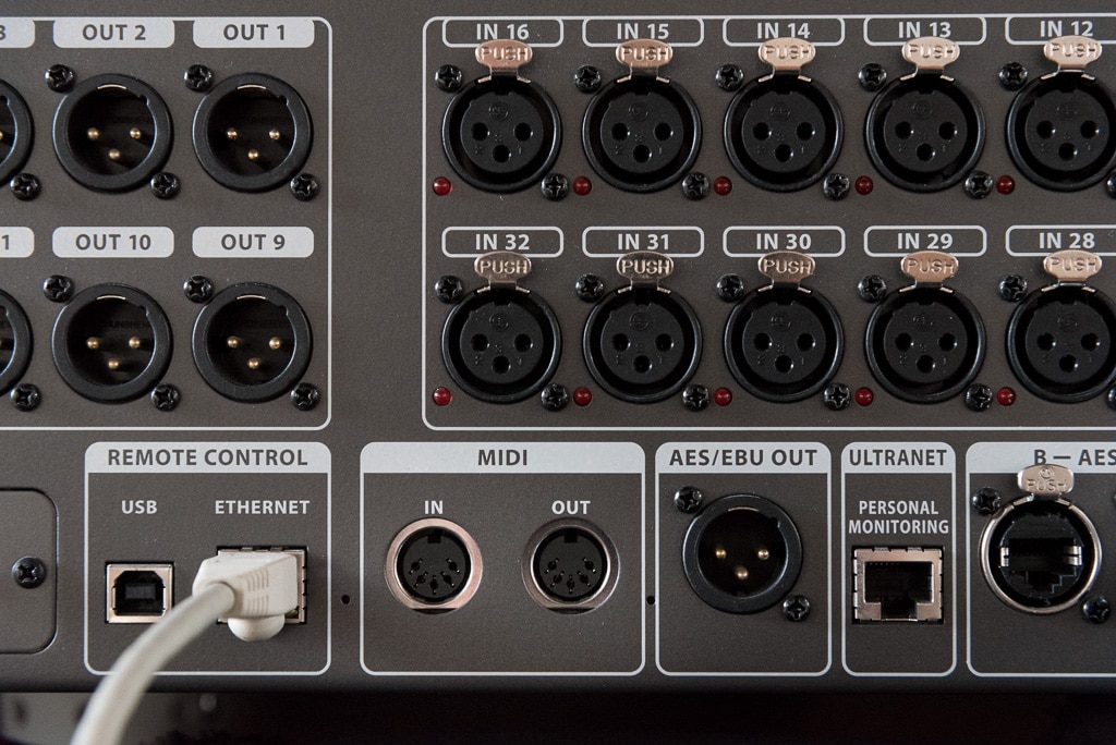 Eine Besonderheit hat das “große” Behringer X32: Ursprünglich waren zwei versteckte Taster vorgesehen. Jetzt wird aber nur eine der zwei Bohrungen neben den MIDI-Buchsen genutzt: Hier erzwingt man einen sofortigen Reset des Pultes.