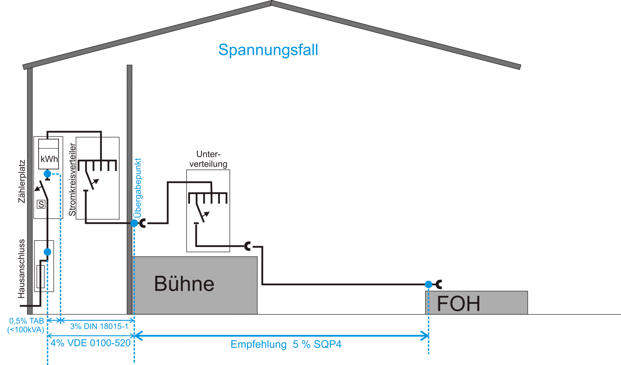 Früher fand ein Spannungsfall von 3% allgemeine Anwendung. Das war zu der Zeit, als in Westdeutschland Veranstaltungstechnik noch gar keinen Lehrberuf hatte, sondern man als ausgebildeter Elektriker als Beleuchter in einem Theater oder Produktionsbetrieb arbeitete. Aber woher stammen diese 3%, üblicherweise zwischen Hausanschluss und den Steckdosen oder Geräteanschlussklemmen? Es gab zu der Zeit gar keine Regel oder DIN-Norm, die den Spannungsfall vom Übergabepunkt im Haus bis zum Verbrauchsgerät geregelt hätte. Aber irgendwo wurden diese 3% herausgekramt. Sei es aus der DIN 18015-1, die vom Zähler bis zum Steckverbinder im Haus gilt, oder der VDE 0100-520 Anhang G und der Niederspannungsanschluss-Verordnung NAV §13, wo jedoch hier der Weg bis zum installierten Beleuchtungsgerät die 3% angibt.