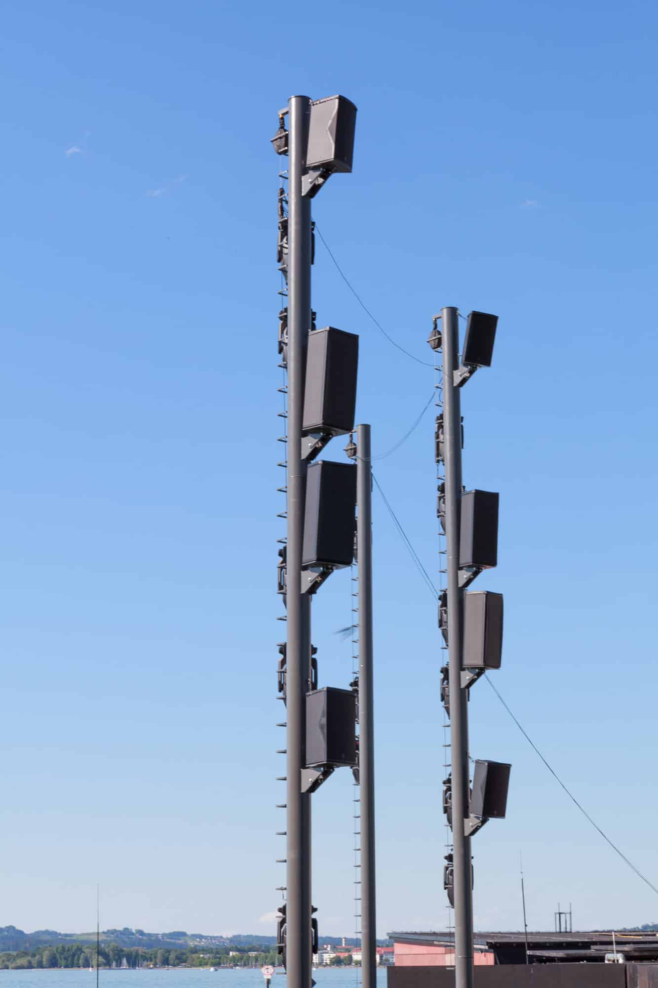 Für das Nahfeld sind Adamson-Lautsprecher Point 12 zwischen Bühne und Tribüne auf Ständern im Wasser montiert. Das Orchester wird vornehmlich von den KV2 ESR212 wiedergegeben, die an jeweils zwei hohen Pfosten rechts und links der Bühne platziert sind. Durch die Verteilung der Pfosten fast über die Tribünenbreite wird ein räumliches Klangbild in der Horizontalen ermöglicht. Mit den KV2 ESR212 an jedem Pfosten gelingt auch eine Höhenstaffelung der Orchesterwiedergabe.