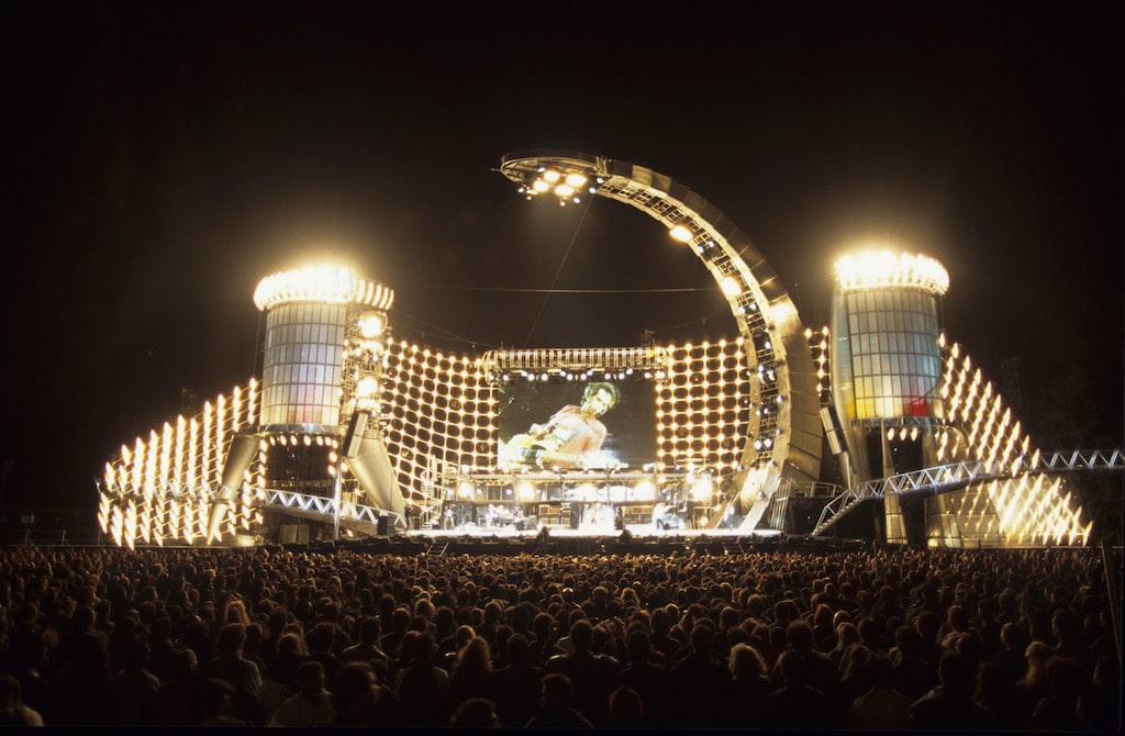 Winkler: Ja, der überwiegende Teil der Elemente, die wir verwenden, sind Standard-Bausteine. Außer du bist U2 und wir entwickeln einen komplett neuen Screen – wie wir es für die 360°-Tour oder „The Joshua Tree“ umgesetzt haben – bist du ziemlich an das gebunden, was der Markt anbietet, und nutzt herkömmliche Videoscreens. Das gleiche gilt für Licht und Sound. Du hast also diese Zutaten und weißt, dass sie in empfindlicher Balance zueinanderstehen: Sound muss in einer bestimmten Position hängen, Videoscreens und Licht ebenfalls. Wie du mit den Einschränkungen umgehst und sie arrangierst, in welchen Proportionen, darin besteht die Freiheit des Architekten. Du könntest zu mir kommen und sagen, „ich habe 15 Millionen Backsteine“, darauf würde ich antworten, dass ich 15 Millionen Arten hätte, sie einzusetzen. Wie mit Lego: Vier Lego-Bausteine geben dir praktisch Milliarden Möglichkeiten, sie zusammenzubauen. Was ich sagen will: Eine begrenzte Anzahl an Zutaten limitiert nicht die Möglichkeiten dessen, was du damit umsetzen kannst. Was meine Laufbahn angeht: Wenn du dir die „Vertical“-Tour von U2 und „Close Encounter“ von Robbie Williams ansiehst, die Produktions-Elemente wegnimmst und nur auf die Rahmenstruktur blickst, sind die Bühnen sozusagen dieselben – sie sehen am Ende allerdings komplett unterschiedlich aus. Eine war gelb und heroisch, hatte große Ausleger, die andere war viel glatter – aber die Infrastruktur dahinter war praktisch identisch. […] Im Großen und Ganzen dient Entertainment-Architektur dem höheren Zweck, Standard-Bausteine der Industrie zu nehmen und sie so zusammen zu bauen, dass ein neues, unverbrauchtes Gesamtbild entsteht, dass maßgeschneidert für die Band wirkt. Die Zutaten zur Umsetzung sind hingegen recht genau definiert: Eine gesamte Industrie ist inzwischen damit „erwachsen geworden“, von A nach B auf schnelle und effiziente Art zu touren.