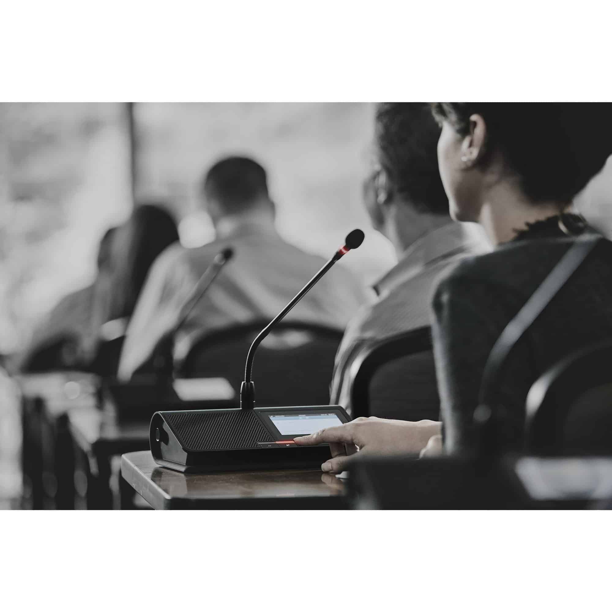 Darüber hinaus kann sie auch beispielsweise nur als Zuhörer definiert werden. „Zudem existiert auch die Funktion ,Dual Delegate‘ – zwei Leute teilen sich eine Sprechstelle und können über zwei Namen separat an einer Konferenz teilnehmen, indem einer die linke Taste zum Sprechen benutzt, der andere die rechte.“ Das Mikrofon müsse zwar geteilt werden, aber es wird jeweils der Name des korrekten Sprechers eingeblendet.