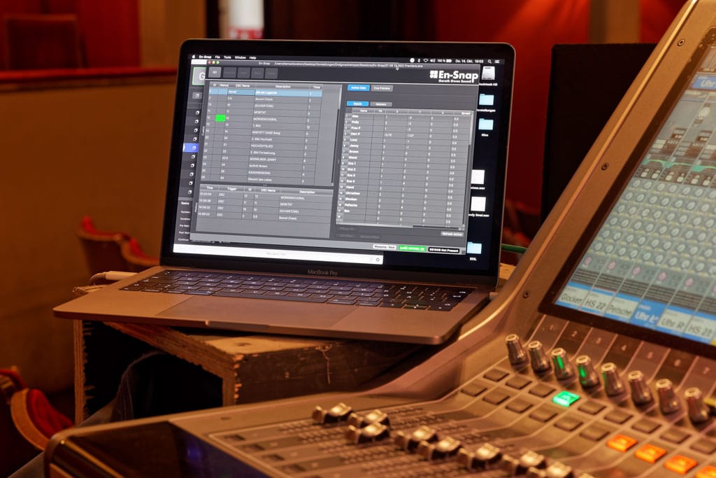 Für jede Szene der Dreigroschenoper hat Tondesigner Holger Schwark während der Proben einen passenden Snapshot für das Objektpositionierungs-Tool En-Scene erstellt, welches Bestandteil der Soundscape-Infrastruktur ist und über die R1-Software bedient wird. Um Parameter der Klangobjekte in der DS100 Signal Engine mit individuell passender Überblendungszeit von einem in den nächsten Zustand überführen zu können, kommt die Automations-Software En-Snap von Gareth Owen Sound zum Einsatz. Zum komfortablen Abruf der En-Snap-Snapshots und der Digitalpult-Szenen in einer gemeinsamen Cue-Liste wird am BE die MacOS-Software QLab verwendet, welche die angeschlossenen Systeme via OSC bzw. MIDI steuert.