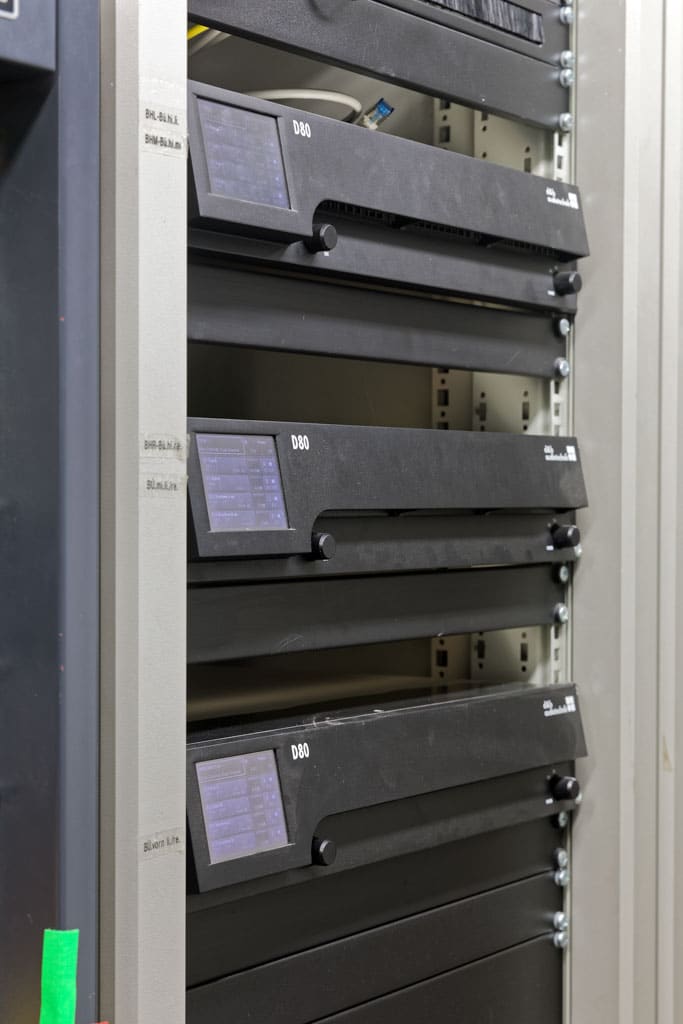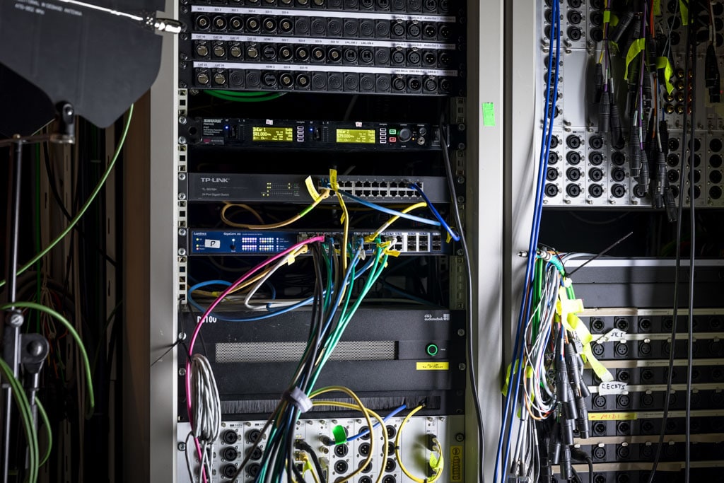 Im zum Großen Haus gehörenden Regieraum ist in einem 19″-Rack eine d&b DS100 Signal Engine als Herzstück von Soundscape untergebracht. Das Dante-Netzwerk des Hauses ist vollständig redundant (primary/secondary) ausgelegt und beinhaltet zum Audinate-Protokoll kompatible 19″-Switches.