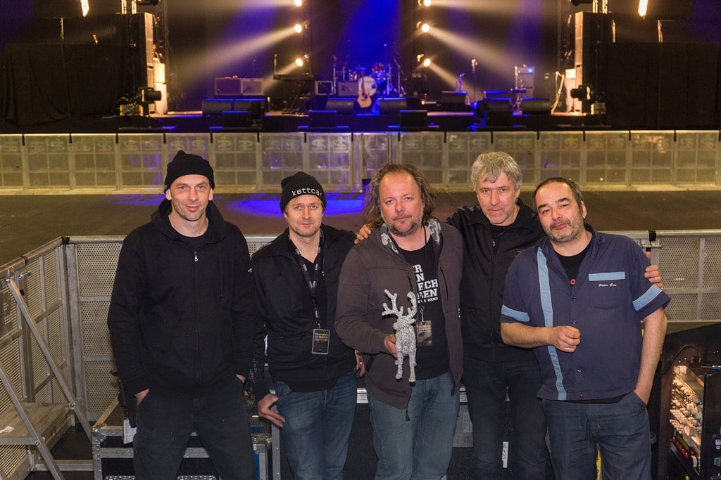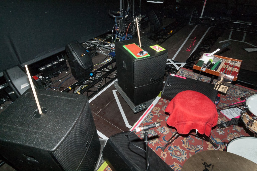 Die Zeilen wurden mit dem neuen Coda Flug-Bass SC3 verlängert, einen Sensor-kontrollierten Doppel-15er. Dieser koppelte im unteren Mittenbereich an und lieferte den gewünschten „KickBass“, um eine schöne Bassdrum zu bekommen. Für die unteren Bereiche sorgten Coda SCP-F (Sensor-controlled Doppel-18er-Subbässe). Überdies wurden 20 Elemente Coda ViRay eingesetzt – ein kleines Line-Array mit Doppel-8″, das je nach Venue als Out- und Delay-Hang eingesetzt werden konnte. Für die lange schmale Bochumer Jahrhunderthalle wurde daraus ein Mono-Delay, platziert über dem FOH-Platz. Als Front Fills wurden Coda G712 eingesetzt. „Diese Multifunktionsboxen mit einem 12-Zoll-Speaker besitzen ein 2-Wege-Mitten-/Hochtonsystem, das sehr gut funktioniert. Meine ganz persönliche Auffassung ist, dass dies besser arbeitet, als zwei ‚Scheiben‘ des VIRAY Line-Arrays hinzulegen“, erklärte Merten Wagnitz und begründete die Entscheidung: „Die Abstrahl-Charakteristik der G712 erscheint weniger eng gefasst zu sein und man hat nicht das Gefühl, dass dich der Sound anschreit, wenn man über die Achse des Systems geht. Wir haben die G712 hier erstmals an dieser Position ausprobiert und ich würde es zukünftig wieder so machen. Der Innenraum klingt richtig super. Diese Lösung liefert einen weniger, anschreienden‘ Klangeindruck, den man bei kleinen Line-Arrays sonst schon mal hat. Wir spielen ja keine Festivals mit einem 4 m breiten Graben vor der Bühne.“ Als Side Fills wurden wie schon auf den Tourneen zuvor Nexo Alpha Fullstack Einheiten eingesetzt: Nexo Alpha B1 S2 und M3. Um eine homogene Bass-Entwicklung zu erreichen, wurden jeweils zwei Doppel-18er SCP-F übereinander vor der Bühne aufgestellt. Alle Einheiten wurden omnidirektional betrieben. „Dadurch bekam die Band ein bisschen Backfire auf der Bühne und empfand das als durchaus positiv. Genau das hatte ihnen bei Line-Arrays mit Cardiobässen bisher gefehlt.“ Insgesamt sechs Elemente des Sub-Arrays wurden auf der Länge von 12 m vor der Bühne verteilt und die benötigten Winkel-Delays jeden Abend in Abhängigkeit der örtlichen Gegebenheiten neu errechnet.