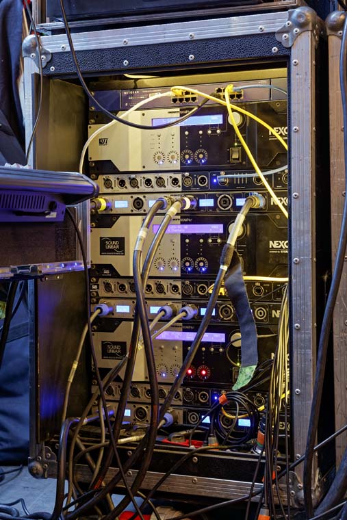 Ampracks mit Nexo NXAMP4X1-Verstärker mit DMU Digital Meter Units und DPU Digital Patching Units sowie Netgear Gigabit-Switches (Bild: Jörg Küster)