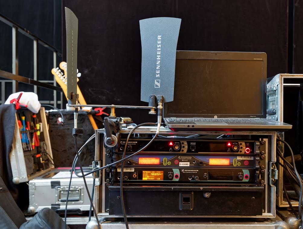 Sennheiser MD 5235 NI mit nierenfömiger Richtcharakteristik an einem Handsender SKM 5000 – die Kombination ist landläufig als „Rockheiser“ bekannt und wurde auf der Tournee mit einem Empfänger EM 3732 betrieben. Die Überlegung, dass sich für Louisans Stimme tendenziell eine Kondensatorkapsel anbieten würde, bedenkt der Monitormischer mit den Worten „totaler Bullshit“: „Sie klebt am Mikrofon und klingt mit der dynamischen Kapsel super!“, so Sehrbrock. Anzumerken wäre in diesem Zusammenhang, dass die Band am Abend absolut diszipliniert und vergleichsweise leise spielte.