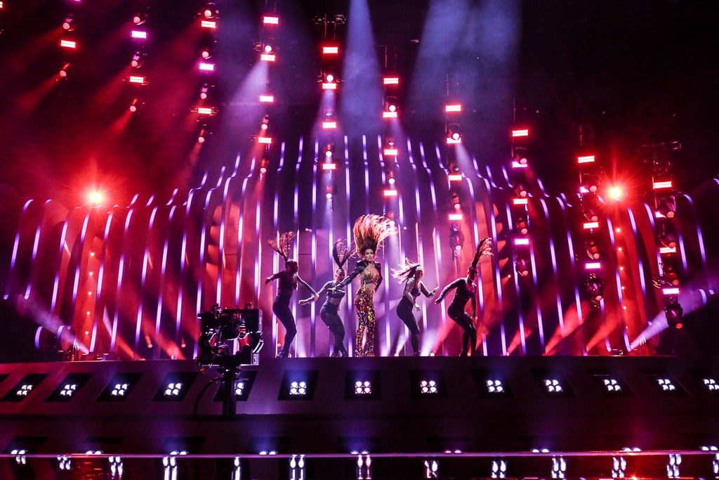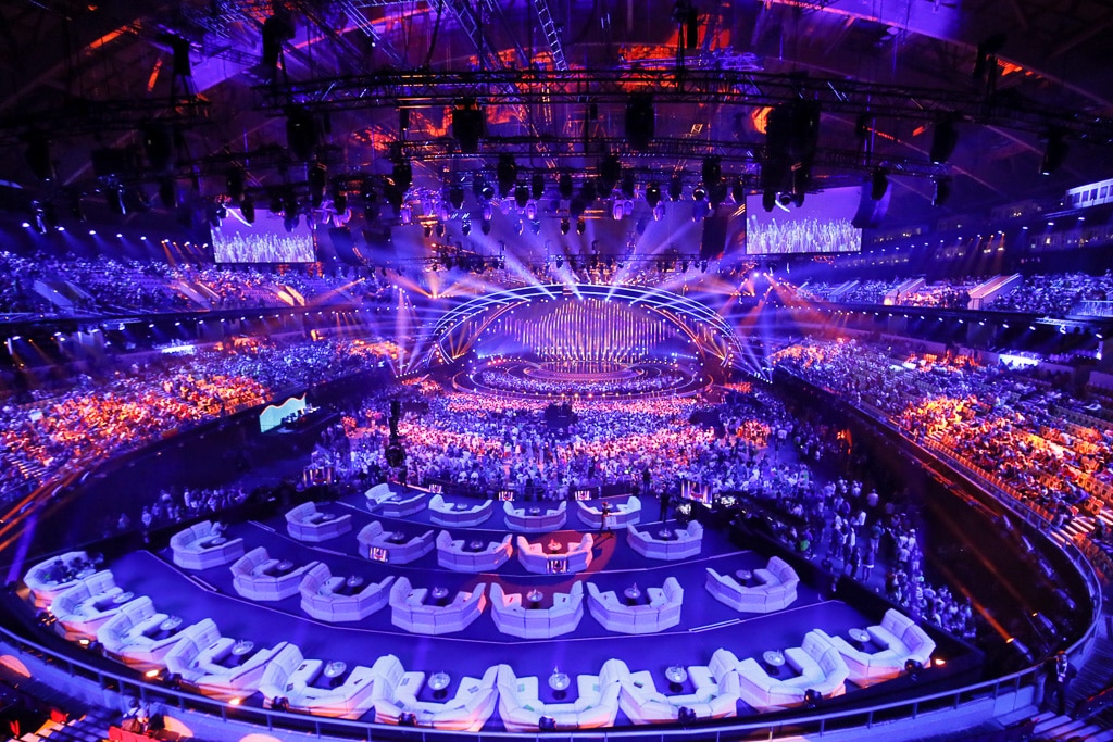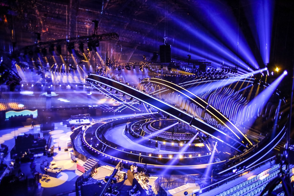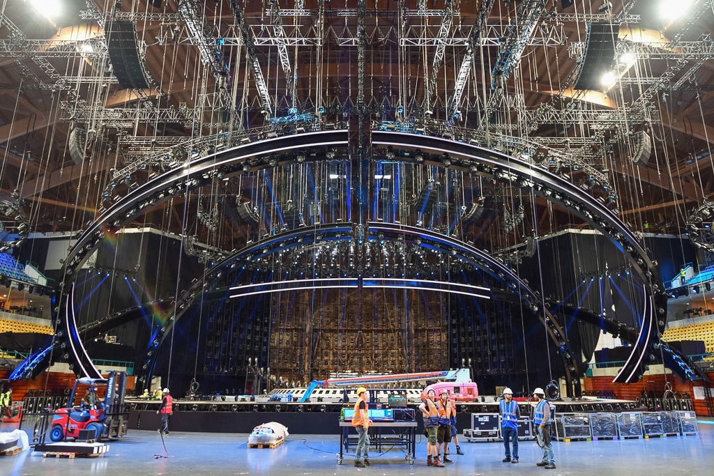 Der Verzicht auf eine bühneneigene LED-Wand war natürlich eine Herausforderung an die einzelnen Teilnehmer, die sie auch vielfach angenommen haben und mit tollen Ideen kamen. Es gibt dieses Jahr erheblich mehr Kulissenteile als sonst, aber Vorgabe ist, dass sie innerhalb von 40 Sekunden spielfertig auf die Bühne gebracht werden können. Um eine schnelle und exakte Wiederfindung aller Bühnenpositionen zu erreichen, werden diese für die Umbauzeit bei Proben und Show mit einem Laser aus dem Traversensystem auf den Bühnenboden projiziert. Letztes Jahr in Kiev hatten wir eine Ausnahme: die Konstruktion des englischen Beitrags konnten wir trotz aller Bemühungen nicht schneller als in zwei Minuten aufbauen – wir entschieden uns dennoch diese zuzulassen, da sie ein tolles Zusatzelement für die Bühne und die Show war. Und am Ende des Tages ist das doch das warum wir hier sind: eine Show so gut wie möglich abzuliefern.