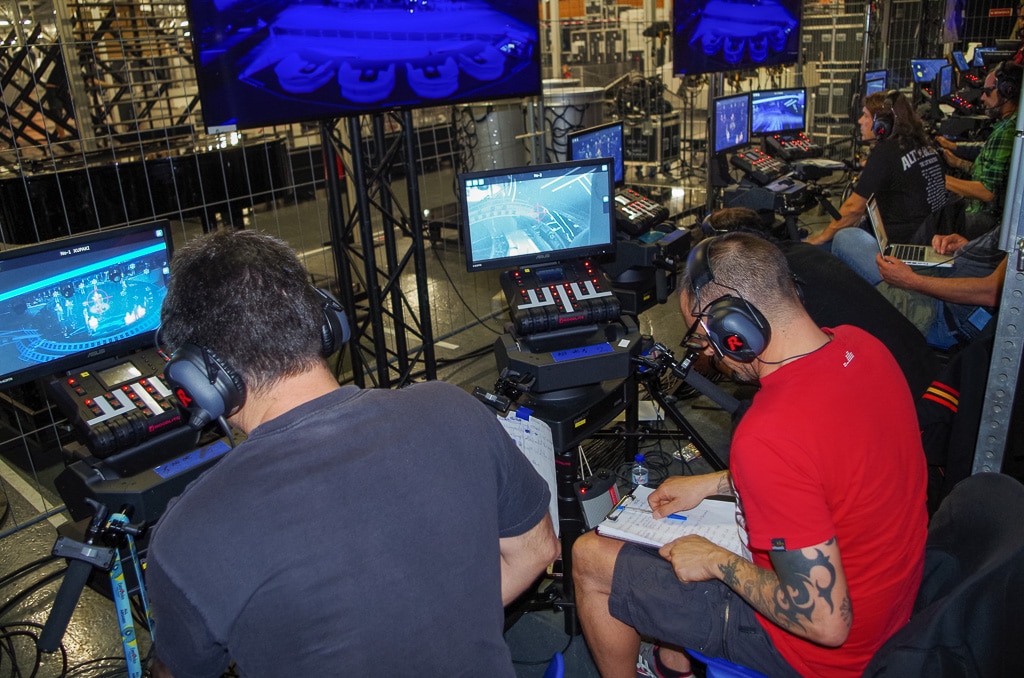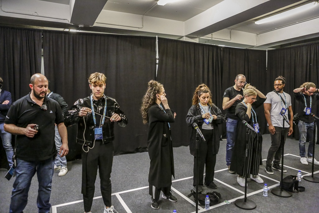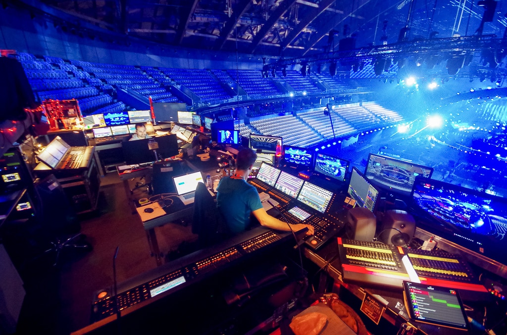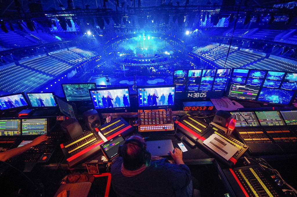 Auch kommt es oft vor, dass die geplanten Bewegungsabläufe der Künstler vor Ort optimiert werden. Es gibt hier mit Marvin Dietmann einen Stagedirector des ESC, der aus der Choreografie kommt. Ein typischer Fall wäre: „Eure Choreografie ist schön gedacht, aber so nicht abzufilmen. Wenn wir das mit der Steadycam so machen wie ihr das wollt, steht die Steadycam mitten auf der Bühne, wenn es weitergeht.“ Daher wird viel noch vor Ort festgelegt. Im Idealfall steht die Choreografie des Künstlers bereits bei der Ankunft, in der Realität ist in Bezug auf Fertigstellungsgrad von 30 bis 90% alles dabei. Wenn dann hier in der Halle die Proben mit den Originalkünstlern beginnen, gehen die Delegationen nach den Bühnenproben in den Viewing Room, schauen sich den Auftritt ihres Künstlers als Aufzeichnung an und können Wünsche bezüglich der Schnitte äußern. Diese werden dann in Absprache mit dem Regisseur umgesetzt. Dabei hat der Einsatz des in CuePilot programmierten Bildschnittes den Vorteil, dass man mit den Delegationen nicht über das Timing der Schnitte diskutieren muss, da diese immer exakt nach der vorherigen Programmierung erfolgen. Natürlich müssen die Kameraleute aber immer noch rechtzeitig den jeweils gewünschten Bildausschnitt finden.“