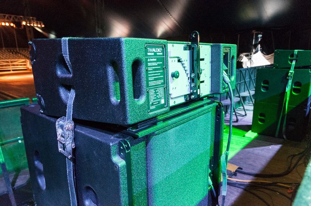 Zu TW Audio verbindet Berthold eine lange Geschichte, mit dem Firmengründer hat er vor Jahrzehnten bereits unter anderem Label erste Beschallungsprodukte mitentwickelt, und auch zu den ersten Hoellstern-Kunden kann sich PLM zählen. Zu aktuellen Produkten gibt er wie andere Verleiher noch Input, schätzt aber auch den gebotenen Abstand – es wäre sicher nicht gut wenn sozusagen beim Hersteller noch ein Verleiher in – direkt mit im Haus sitzen würde. Eingesetzt hat PLM in Winterbach nun erstmals das VERA36 von TW Audio, ergänzt durch sechs BSX-Subwoofer: 2 × 11 Elemente dienten als Main-PA, 2 × 3 Module als Outfill und vier Elemente auf der Bühnenkante als Frontfill. TW-Audio-Material kam auch auf der Bühne zum Zuge: 4 × VERA36 und 4 × S33 als Sidefills sowie als Monitore zwölf C15. „Ich wollte das neue System unbedingt zu dieser Veranstaltung bringen, weil ich einfach zu dem Material steh’. Es sind ja auch viele Techniker hier, die das Material sonst nicht so zeitnah in den Händen hätten, also eine gute Gelegenheit.“ Eine Besonderheit betraf in Winterbach das Amping der VERA36-Elemente: TW Audio setzt auf eine Powersoft-Plattform, zusätzlich wird nun aber auch ein Lab.gruppen-Standard angeboten.
