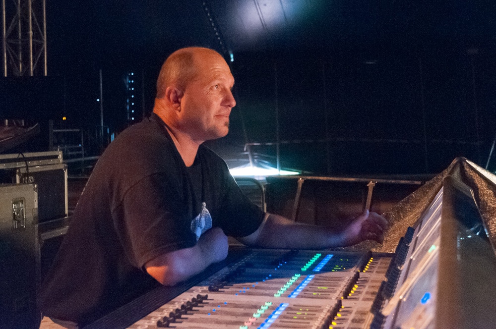 Betrieben wird das Zeltspektakel zwar von einem Verein, die Dimensionen sind dennoch nicht nur beachtlich, sondern auch gleichzeitig eine technische Herausforderung: Das Zirkuszelt mit acht Masten hat so seine Eigenarten in akustischer Hinsicht, aber auch von der nutzbaren Höhe über der Bühne her ist es eine Herausforderung: Das Zelt ist ja nur in der Nähe der Masten – also da, wo es einem nicht viel hilft – wirklich hoch, und entsprechend musste das Rigg für einen Kompromiss aus Belastbarkeit, Optik und Anpassung an das Zeltdach individuell eingerechnet werden. Für all das brauchte es einen gleichermaßen engagierten wie qualifizierten Dienstleister, der im Fall des Zeltspektakels seit 2009 „PML Veranstaltungstechnik“ heißt. Wie engagiert PLM hinter dieser Veranstaltungsreihe steht, wird nicht nur dadurch offensichtlich, dass Firmenchef Berthold Blocher wie hier oft selbst am Pult arbeitet – bereits beim Betreten des Zeltes wird spürbar, wenn man zu Berthold am FOH-Platz herüberschaut: Hier hat jemand wirklich Spaß daran, einen tollen Sound zu mischen.