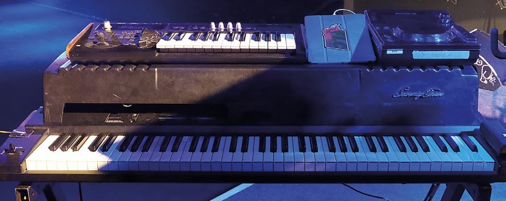 Leisers Bassverstärker-Rig – eine Backline aus zwei Topteilen, darunter je zwei Boxen – nimmt ungeahnt viel Platz auf der kompakten Bühne ein. Ein Stack verstärkt den fünfsaitigen Fender Jazz Bass, das andere das Synth-Bass-Setup, das er teils mit Pedalen bedient, wenn er gleichzeitig Keyboards oder andere Instrumente spielt. „Ich sehe mein Setup im Stil eines modernen Ray Manzarek”, erklärt Leiser. „Ray spielte die Bass-Parts bei The Doors live immer über ein Rhodes Bass-Keyboard, das in einen E-Bass-Amp eingestöpselt war. Sein Setup inspirierte mich, meinen Keyboard-Bass über einen Amp wie meine Bassgitarre laufen zu lassen. Dadurch bleibt das Bassfundament konsistent, sowohl auf der Bühne als auch Front of House.“ Beim Blick auf das Keyboard-Setup fällt die Optik eines alten Fender Rhodes ins Auge – sie besteht aus dem Deckel eines alten Originals, darunter verbirgt sich ein Roland A33-Controller. „Als ich mein Keyboard-Setup aufgebaut habe, wollte ich ein ‚Vintage-Feeling‘“, meint Leiser. Darauf liegt zudem ein kleines Korg Micro-X-Keyboard, daneben ein iPad – als Textstütze, nachdem er erst kürzlich die Lead Vocals mit übernommen hat. Das iPad diene „mehr zur Sicherheit statt als Notwendigkeit“, wie Leiser sagt. Daneben befindet sich ein Pioneer XDJ, mit dem der Musiker die Backing Tracks von einem USB-Stick abruft. „Ein Kanal liefert einen Click-Track für [Schlagzeuger] Frank, der zweite Kanal einen Mono-Mix von verschiedenen Beats und Sounds für das FOH-Signal.“