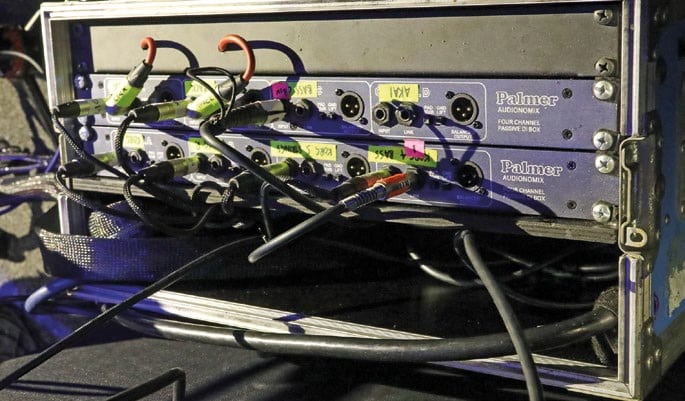 Die beiden Bassverstärker und die Keyboards werden nur per DI abgenommen. „Alle Bass- und Keyboard-Signale laufen in einen Splitter“, erklärt „Mash“ Marshall. Er verweist auf ein Rack mit zwei Palmer Audionomix-Vierkanal-DI-Boxen und Split-Funktion, das sie überall hin mitnehmen. „Die Signale laufen auf das Monitorpult von [Schlagzeuger] Frank, sodass er sich die Signale für sein Monitoring so zusammenstellen kann, wie er sie braucht.“