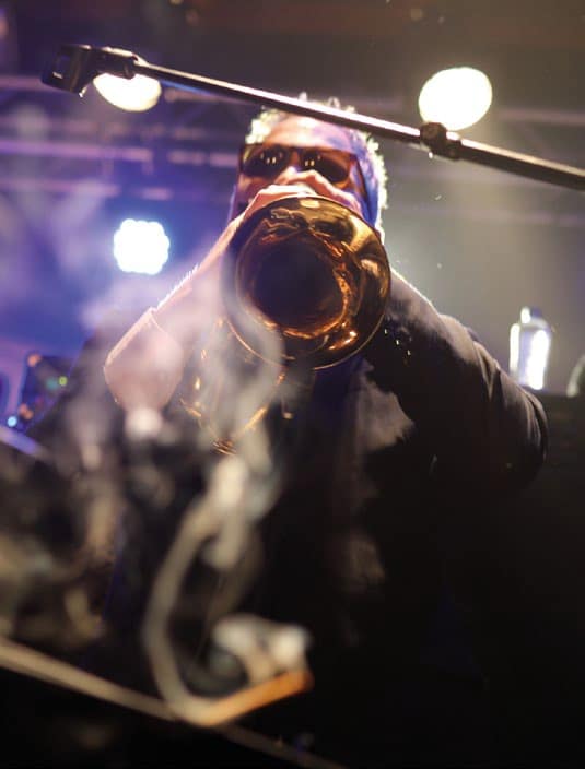 Brian „Fast“ Leiser an seinem Keyboardplatz, hier an der Trompete. Unten am Keyboard glimmt ein Räucherstäbchen, das ein Roadie kurz vor Konzertbeginn angezündet hat. (Bild: Nicolay Ketterer)