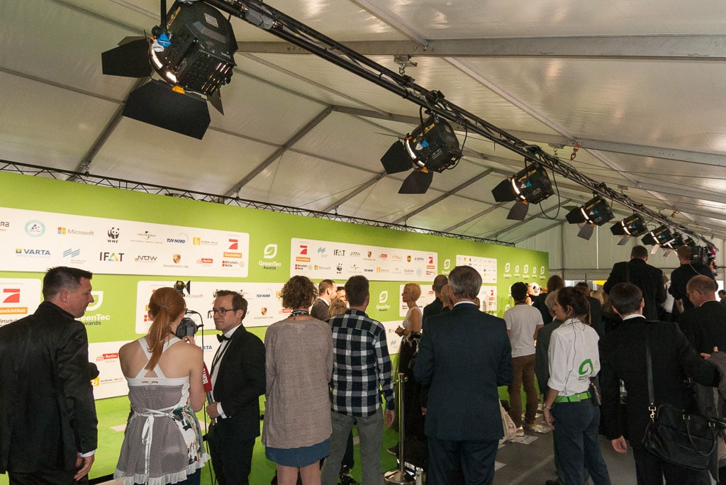 Ziel der jährlichen Preisverleihung „GreenTec Award“ ist, Innovationen bei Umwelttechnologien einer breiten Öffentlichkeit zu präsentieren. Ausgezeichnet werden seit 2008 innovative Produkte und Projekte, die Maßstäbe bei Umwelttechnologien setzen und einen ökologischen Lebensstil fördern. Für die rund 1000 geladenen Gäste der GreenTec Awards in Berlin war dazu passend ein grüner Teppich aus recyceltem „Ocean Plastic“ in einem Losberger-Zelt ausgerollt worden, ein Porsche Shuttle-Service brachte VIPs in neusten Modellen der SE Hybrid-Reihe zur Gala. Alle übrigen Besucher wurden gebeten, mit öffentlichen Verkehrsmitteln anzureisen. Im Foyer des Tempodroms präsentierten sich dann über 30 Aussteller mit nachhaltigen Projekten und Produkten – eine entspannte Leistungsshow in edler und gleichzeitig ungezwungener Atmosphäre.