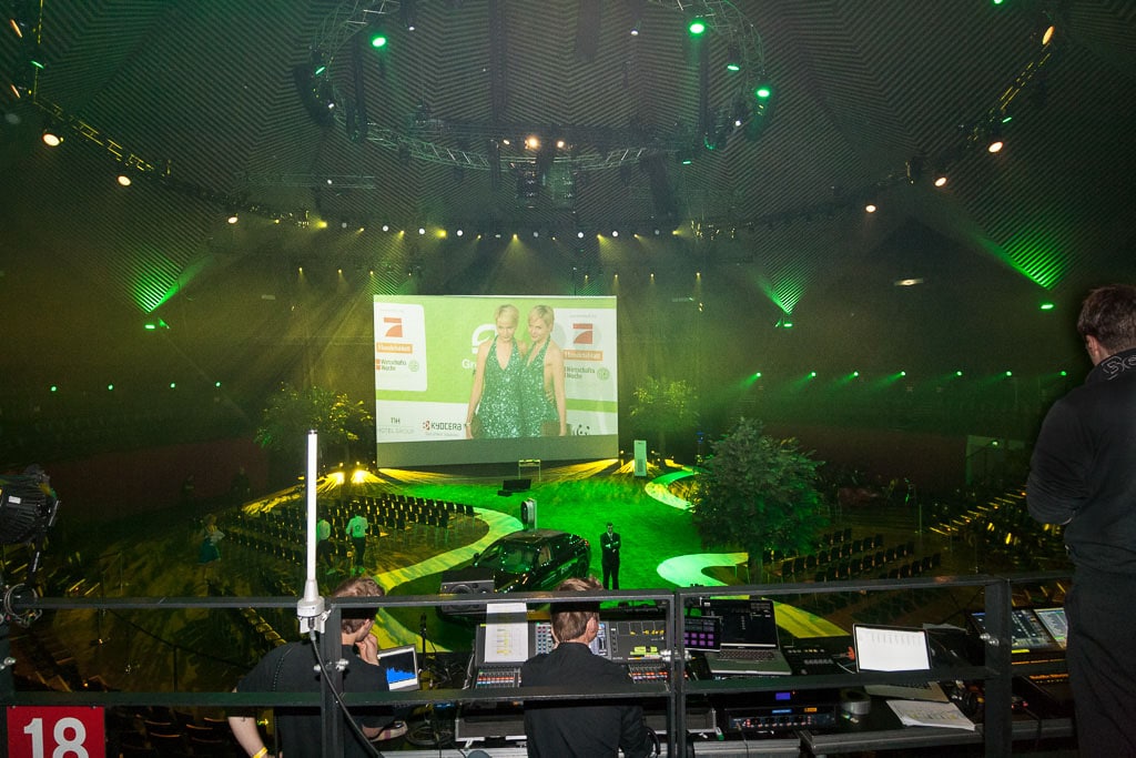 Für das Lichtdesign zeichnete Andreas Vollmer verantwortlich, der die Gala auch als Operator betreute. In enger Zusammenarbeit mit Paul Happ (TL Licht) erfolgten die planerische CAD-Umsetzung und die Beschaffung des technischen Equipments sowie die Aufsicht über die Einhaltung der Nachhaltigkeitsvorgaben. Die Auf gabe lautete, eine beeindruckende Award-Verleihung sowohl für die anwesenden Zuschauer, als auch für die Zuschauer des Web-Streams umzusetzen. Vorgegeben wurde die Bühnensituation, die den ganzen Innenraum des Tempodroms als „Spielplatz“ vorsah: Echter Rasen, Bäume, ein Auto, sowie ein Orchester und die große Leinwand waren markante Eckpunkte. Natürlich sollte die dominierende Farbe grün sein und der Grasboden sowie die Bäume entsprechend ansehnlich herausgearbeitet und unterstützt werden. Die Vorplanung fand zum einen per AutoCAD und firmeneigenen Bibliotheken und Tools statt. Weiterhin wurden per GrandMA 3D sämtliche Looks vorprogrammiert. Vor Ort brauchten nur Positionen angepasst und Details mit den Musikern und dem Regieablauf abgestimmt zu werden. Jeder Auftritt besaß ein jeweils eigenes Showkonzept mit entsprechenden Licht- und VideoCues. Bei der Band Fahrenhaidt etwa zeigte man eine Videoprojektion, die in Interaktion mit den Tänzern stand. Die Musiker von Glasperlenspiel wurden mit MAC Aura von der Rasenkante ausgeleuchtet und die Performance der Band Laing wurde mit SGM P5 und OXO Pixyline als Effekt-Gegenlicht unterstützt.