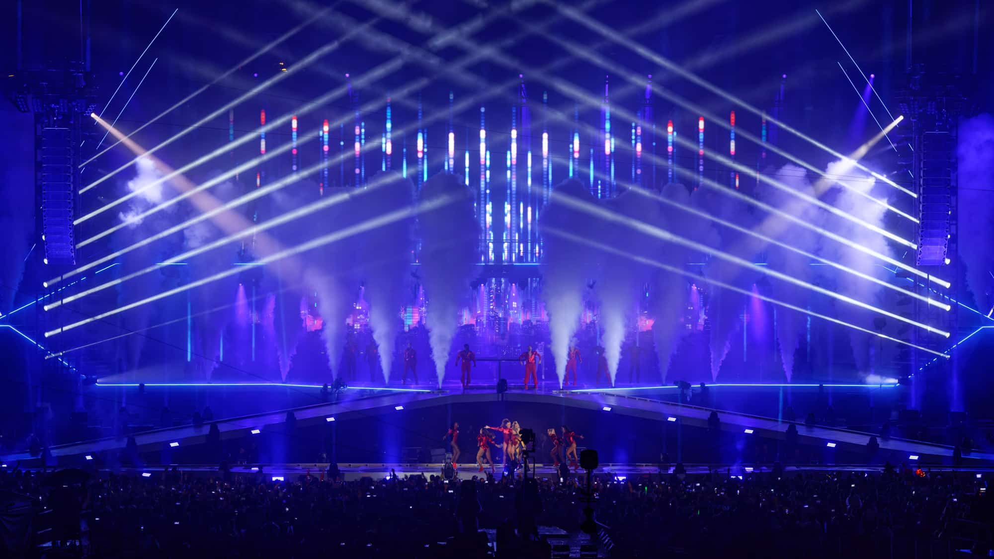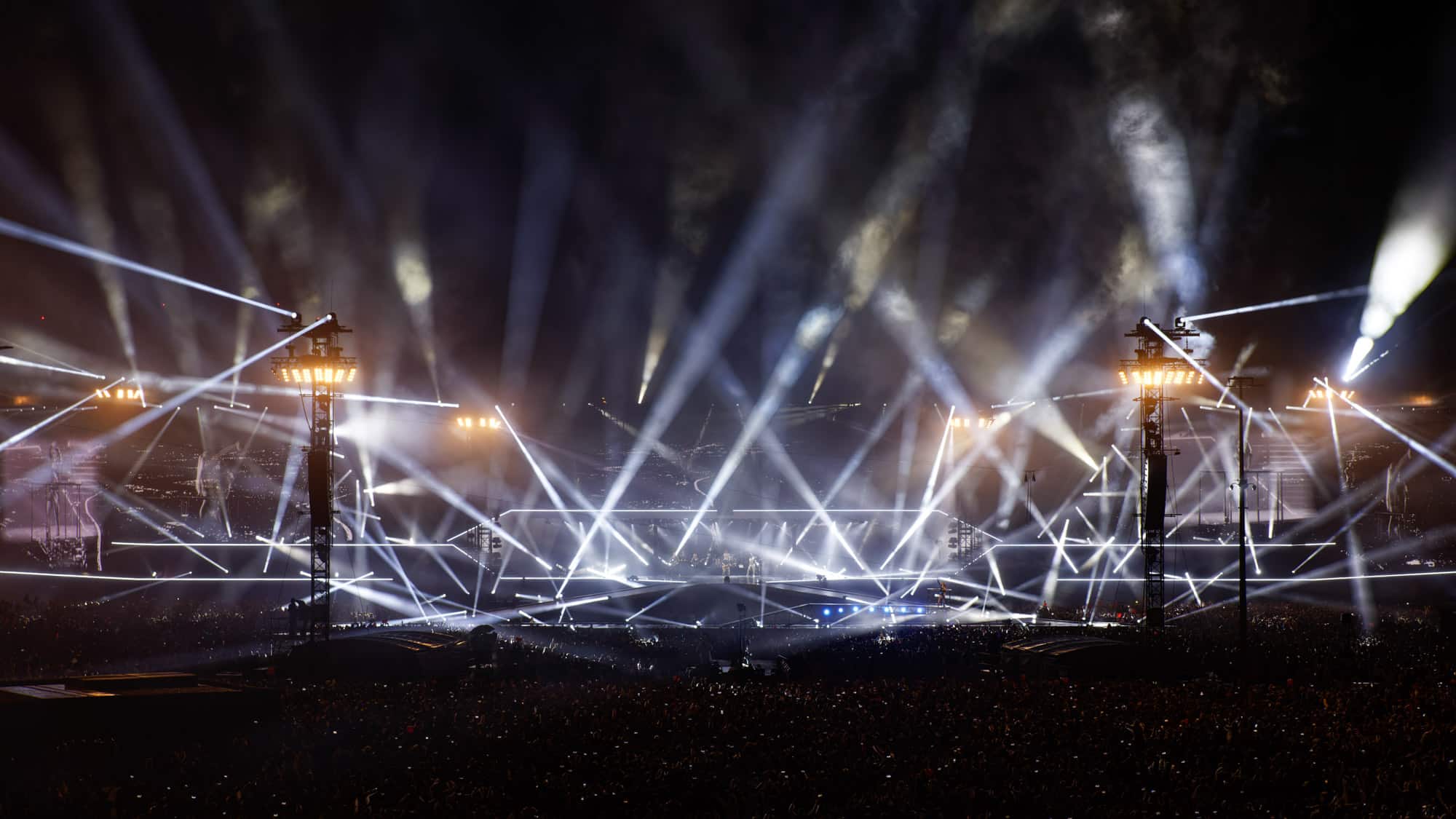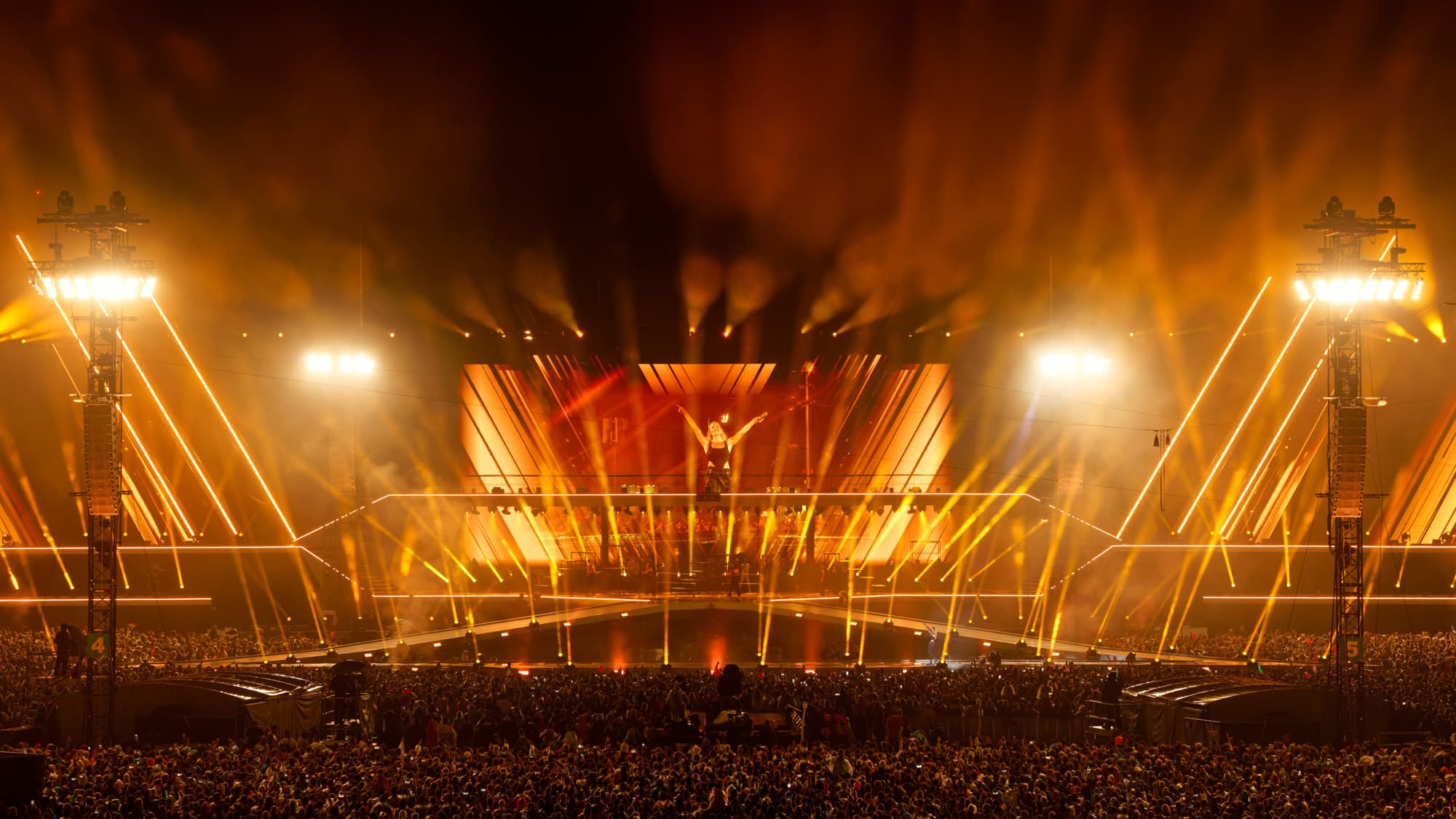 20 Delay Tower hatte die Audio-Mannschaft auf dem Gelände positioniert, 18 davon wurden auch für das Lichtdesign benutzt. Vier Türme vor der Bühne waren Keylight-Positio- nen, auf denen sich jeweils acht BMFL Longthrow befanden. Diese im Follow-Me-System eingebundenen Moving Lights hatten sich bereits während der letzten Rammstein-Tournee in dieser Funktion bestens bewährt. Vertikal an den Säulen hingen besagte BMFL LT. Auf traditionelle Verfolger wurde verzichtet. Stattdessen wurde ein großzügiges Follow-Me-System integriert. Insgesamt waren 250 Lampen in dem System kalibriert und konnten als sehr starkes kreatives Element genutzt werden. SMG P-10 zur Objektbeleuchtung sowie 8Lite-Moles für das Publikum komplettieren das Set Up an den Delay Towern. Auf den Türmen waren jeweils auch zwei Excalibur eingesetzt für große Beam Looks. Es galt schließlich, der Künstlerin – und den Kameras – die 130.000 Gäste zu zeigen. Mit dieser Auswahl konnte die Fläche eindrucksvoll abgedeckt werden.