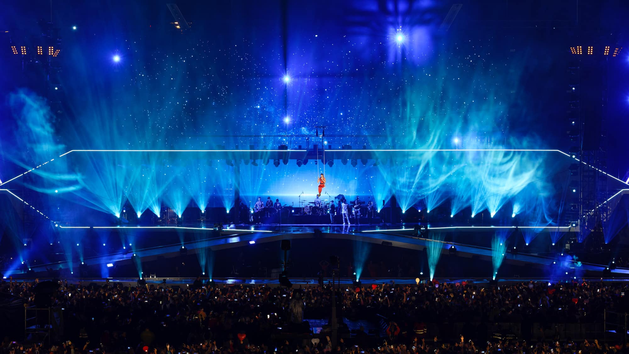 Im Bühnenzentrum befand sich eine ca. 80 m breite Wand aus Layher-Gerüsten als Hintergrund. Diese war – wie die übrigen Traversen auch – komplett verkleidet worden. Darin platziert war ein Lampenmodell, das sich in fast allen Designs von Roland Greil findet: Solaris Flare Q+. Über 100 Stück dieses Models sowie ein weiterer Layer mit 100 Elation Arena Par Zoom bildeten hier Anordnungen, die hinter der Live-Band für eine Vielzahl unterschiedlicher Looks sorgten. Auf der Oberkante der 80 m breiten Wand befanden sich zudem Elation Proteus Maximus sowie zwölf Aryton Cobra, die durch ihre Helligkeit zu überzeugen wussten.