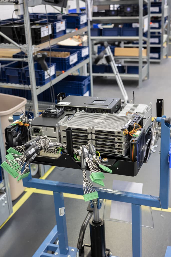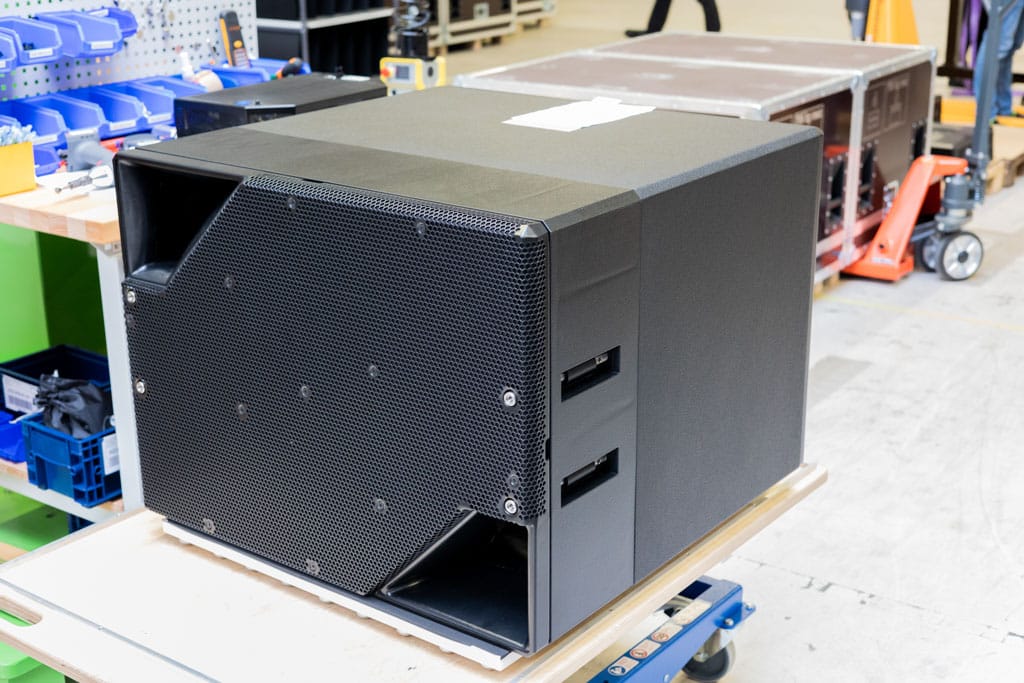 In der Produktionshalle im Süden Berlins bekommt man einen Einblick in die Entwicklung und Herstellung von Holoplot. Ein Team ist für die Hardware verantwortlich, und ganze vier Teams kümmern sich um die Softwareentwicklung. Die technische Komplexität der Arrays lässt sich kaum mit „normalen“ Lautsprechern vergleichen. Das Processing basiert auf FPGAs und passiert direkt in den Lautsprecher-Modulen. Das sorgt für eine hohe Prozesssicherheit, aber auch für eine herausfordernde Programmierung. Die 96 Lautsprecher im „Topteil“ und die 81 Lautsprecher im „Bass“ müssen alle einzeln angesteuert und betrieben werden. Der hohe Anspruch des Projektes lässt nur wenige Hardwarelieferanten zu. So ist die 96-Kanal-Endstufe eine Maßanfertigung auf dem Hause Powersoft und somit alles andere als ein experimentelles Bauteil. Die Lautsprecher entstehen in einer Art Schichtbauweise. Das Modul 80-S – also der Bass – trägt den Basslautsprecher hinter dem Array aus kleineren Lautsprechern, das erleichtert den Fertigungsprozess, da beide Lautsprechertypen in der gleichen Fertigungsstraße zusammengesetzt werden können.