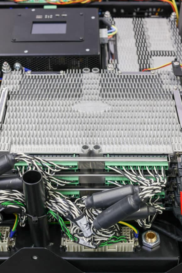 Das Innenleben der X1-Serie erinnert nur wenig an konventionelle Lautsprecher. Processing, Amping, Verkabelung, Strom – für 96 Lautsprecher eine Herausforderung bei dem Formfaktor (Bild: Alexander Heber)