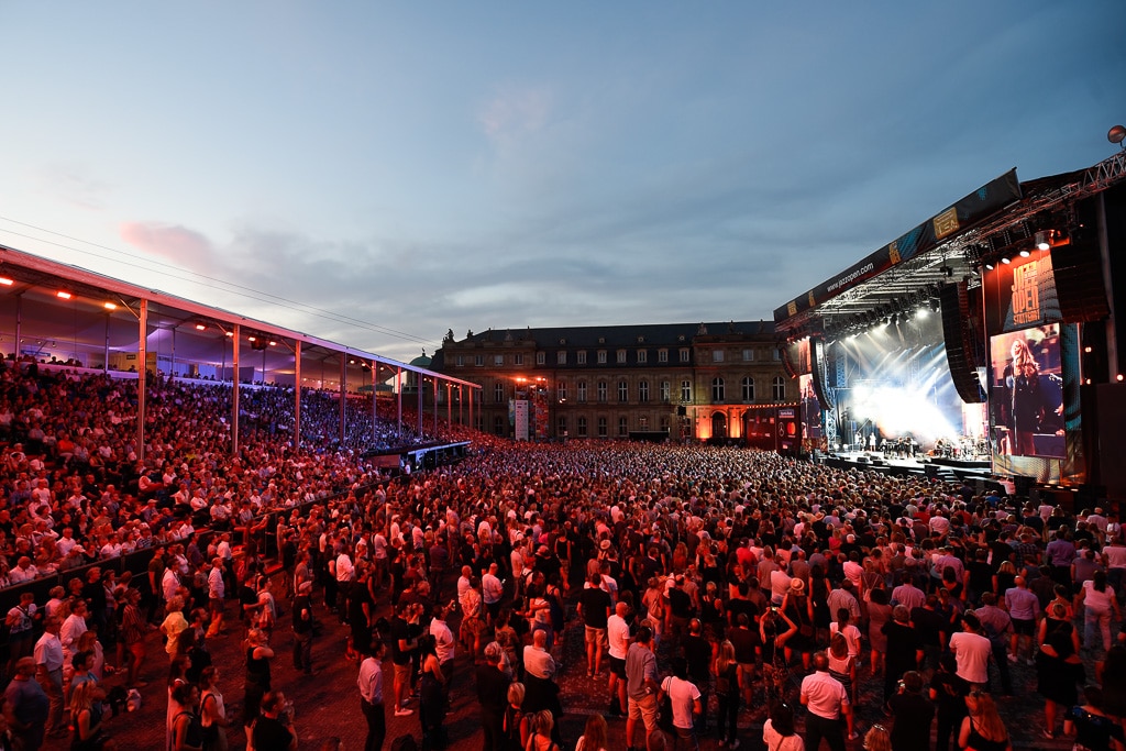Logistisch wie akustisch stellt die Hauptbühne eine Herausforderung dar: Eine überdachte Zuschauertribüne wird vom Schloss „eingerahmt“, in zwei Schlossgebäuden ist das Finanz- und Wirtschaftsministerium des Landes Baden-Württemberg untergebracht. Während des Festivals und des Auf- und Abbaus wird dort gearbeitet, was zusätzliche Hürden mit sich bringt. Seit 2012 ist das Festival von 4.000 auf über 7.000 Zuschauer gewachsen. „Am Anfang stand die Tribüne näher an der Bühne, da wir insgesamt kleiner waren“, erläutert Kreiner die Entwicklung. „Einerseits werden die optischen Anforderungen größer, andererseits auch die Bands, die der Promoter Jürgen Schlensog [Opus Festival Veranstaltungs- und Management GmbH, Anm. d. Red.] bucht. Damit steigen sowohl die Ansprüche der Zuschauer als auch die der Künstler. Inzwischen ist die Kapazitätsgrenze erreicht, um die Atmosphäre noch erhalten zu können. Vor zwei Jahren hatten wir Pink-Floyd-Gitarrist David Gilmour hier, mehr bekommen wir wirklich nicht unter.“ Bei Gilmour waren rund 7.000 Zuschauer vor Ort. „Die Stones oder U2 würden hier natürlich nicht reinpassen“, meint er schmunzelnd. „Würde ich die Tribüne weiter nach hinten schieben, wäre keine Feuerwehrdurchfahrt mehr vorhanden. Bei einer anderen Veranstaltung wurde die Tribüne raus auf den Platz gestellt – dann fehlt allerdings die ‚Fassung’, die Leute sitzen 60 Meter von der Bühne weg.“ Dahinter befindet sich ein Park, auf der sich Zaungäste „berieseln“ lassen, die Sicht ist durch die Tribüne versperrt. „Für das Publikum ist die Atmosphäre spannend, hier Jamiroquai oder Lenny Kravitz zu sehen.“